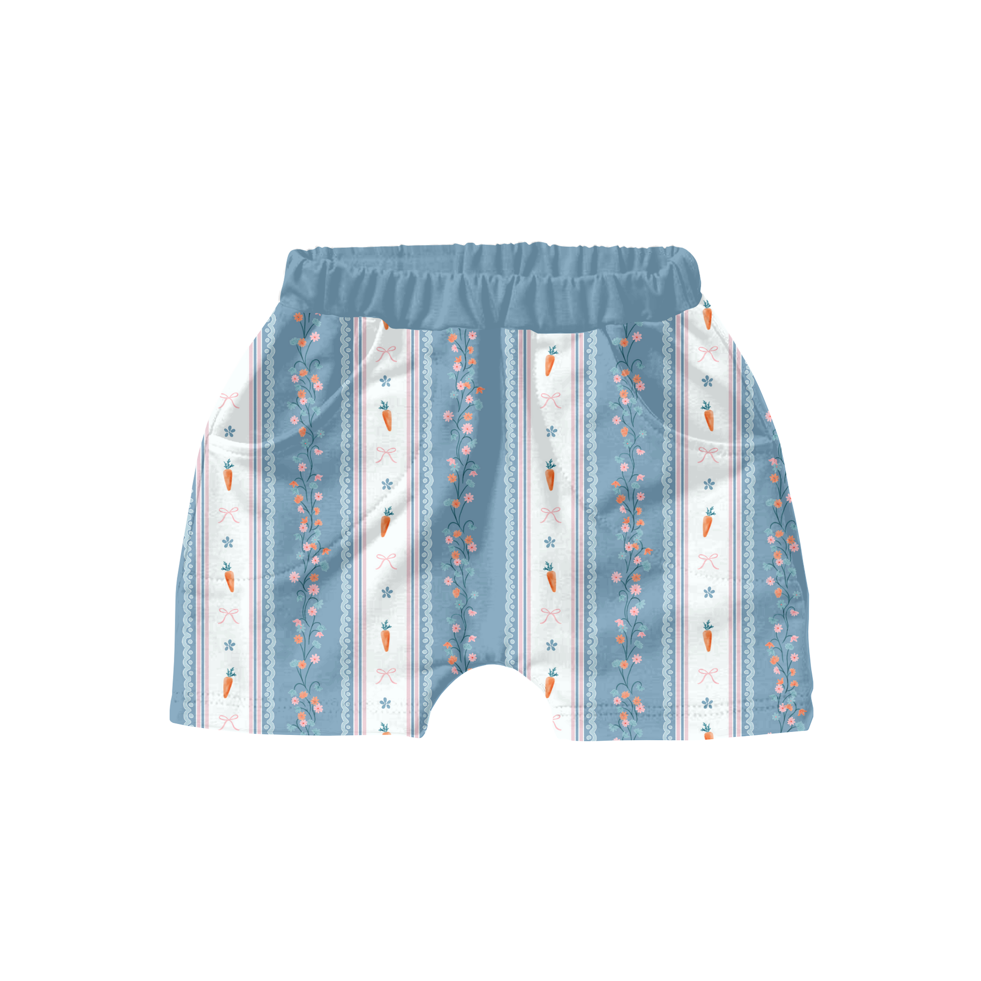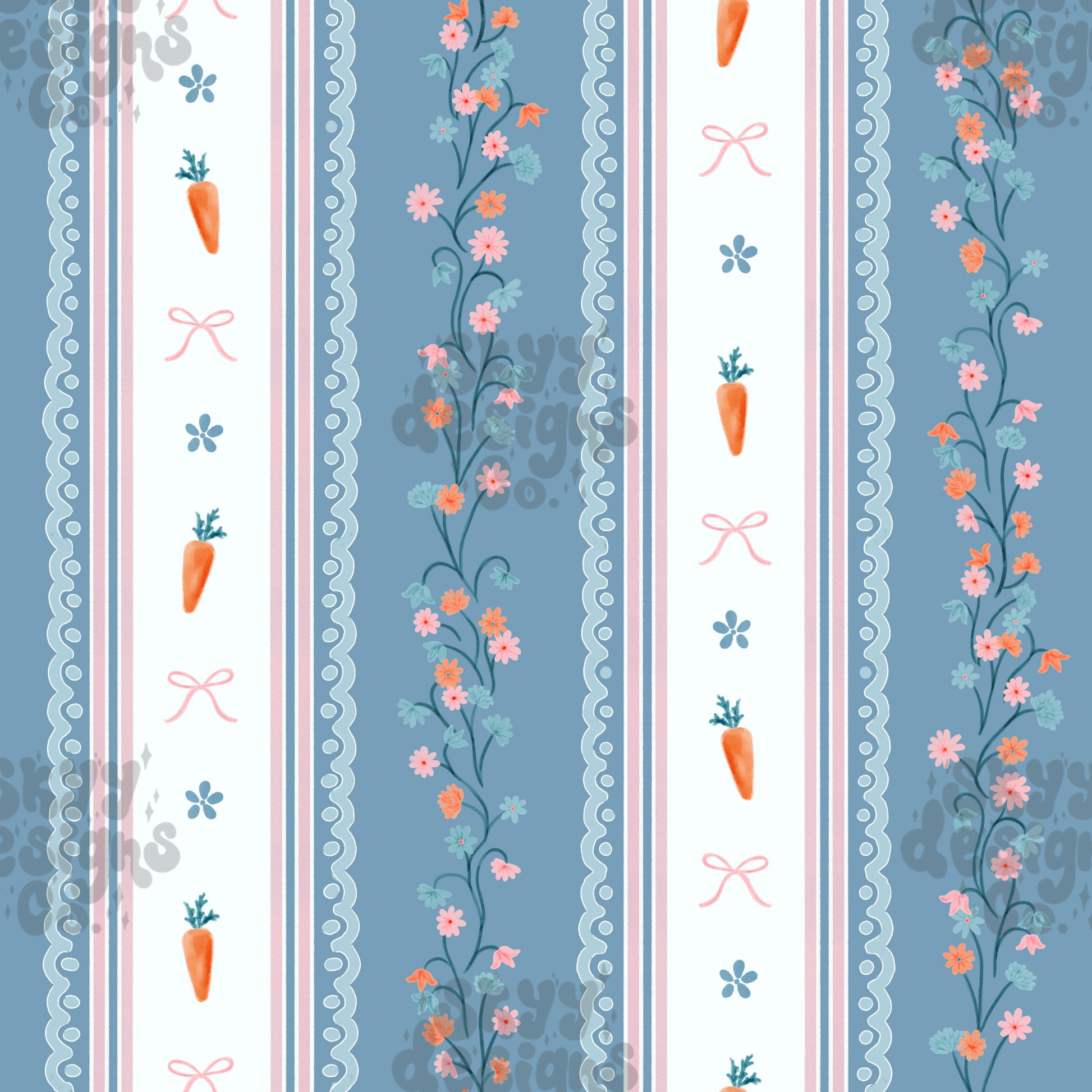 Elevate your Easter designs with this charming digital seamless pattern featuring delicate blue florals, coquette lace stripes, playful carrots, and whimsical bows. Perfect for the spring season, this instantly downloadable design seamlessly repeats across any product—from apparel to home décor.