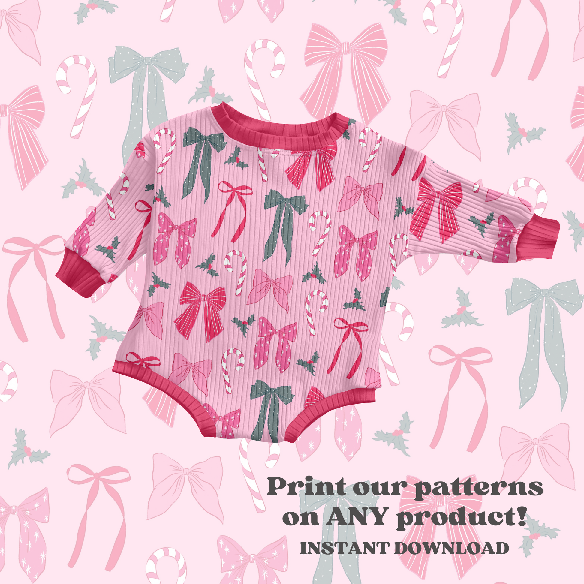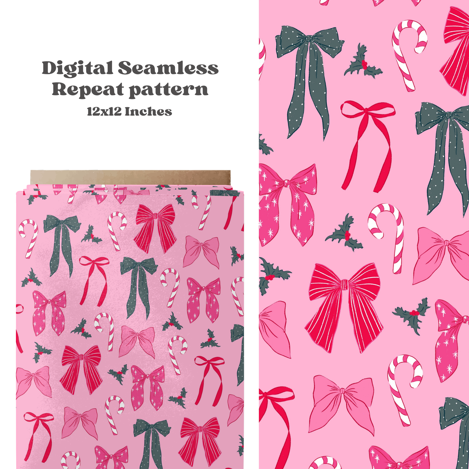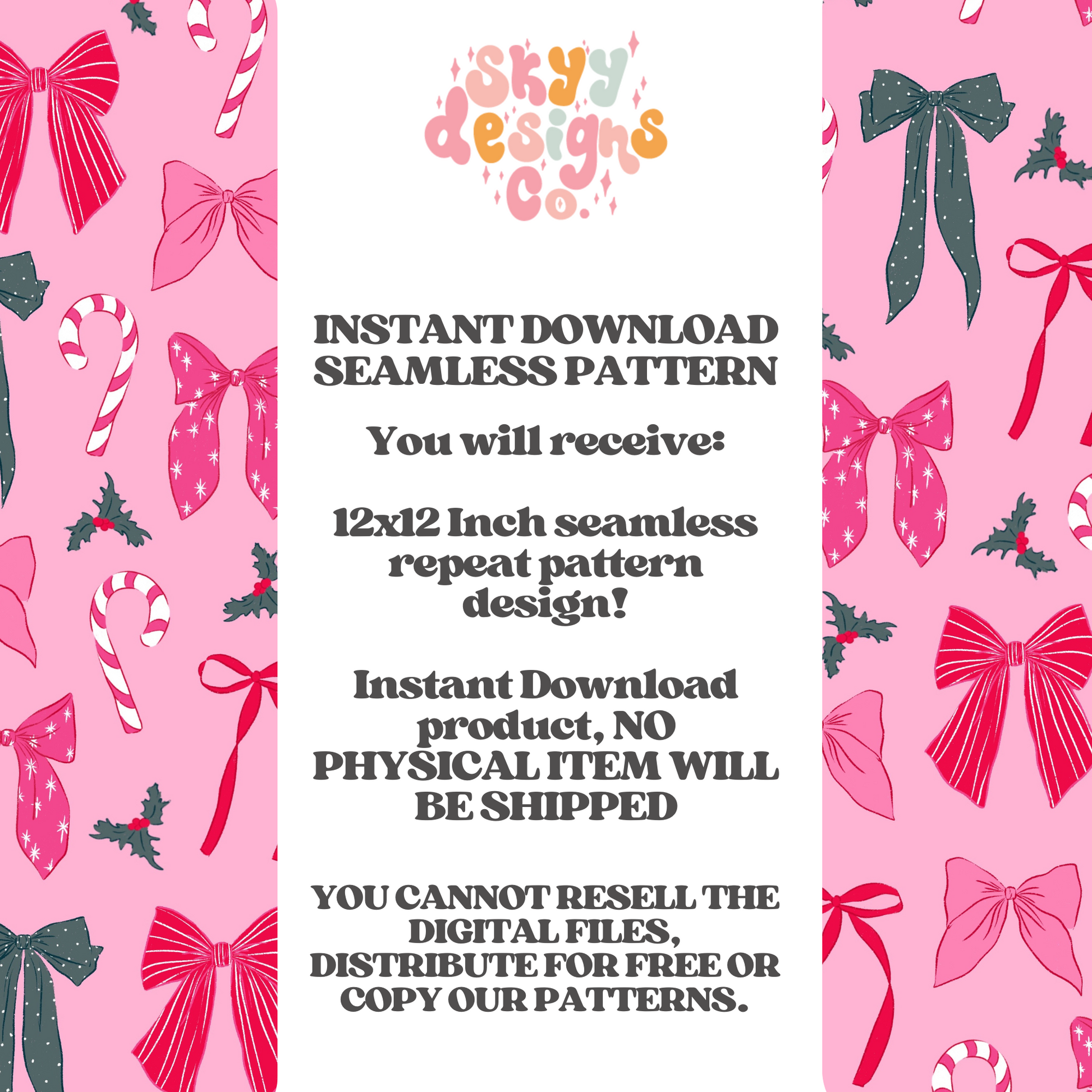 This Preppy Christmas Bows seamless pattern in JPEG format features charming bows, candy canes, and mistletoe, perfect for adding a festive touch to any holiday-themed product.