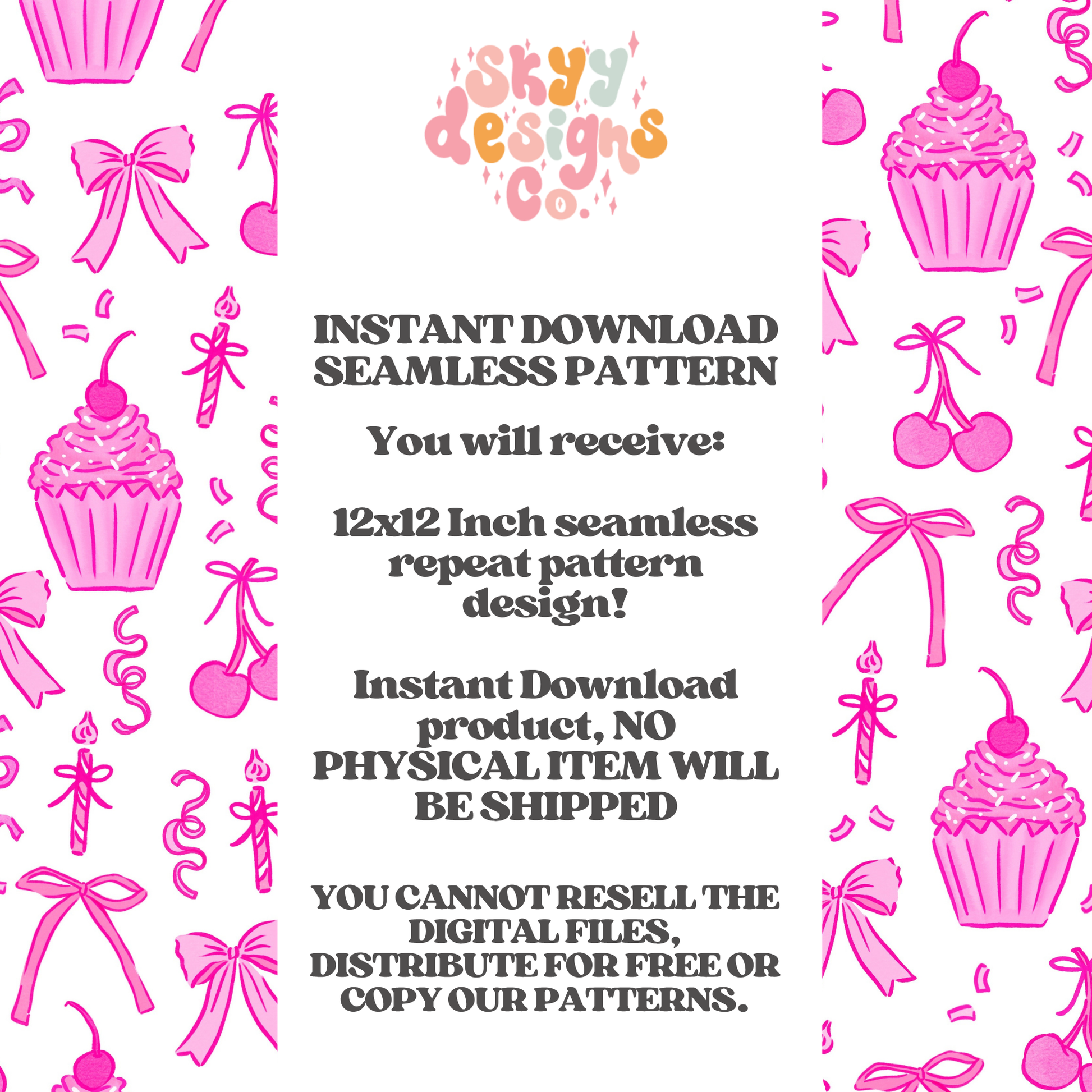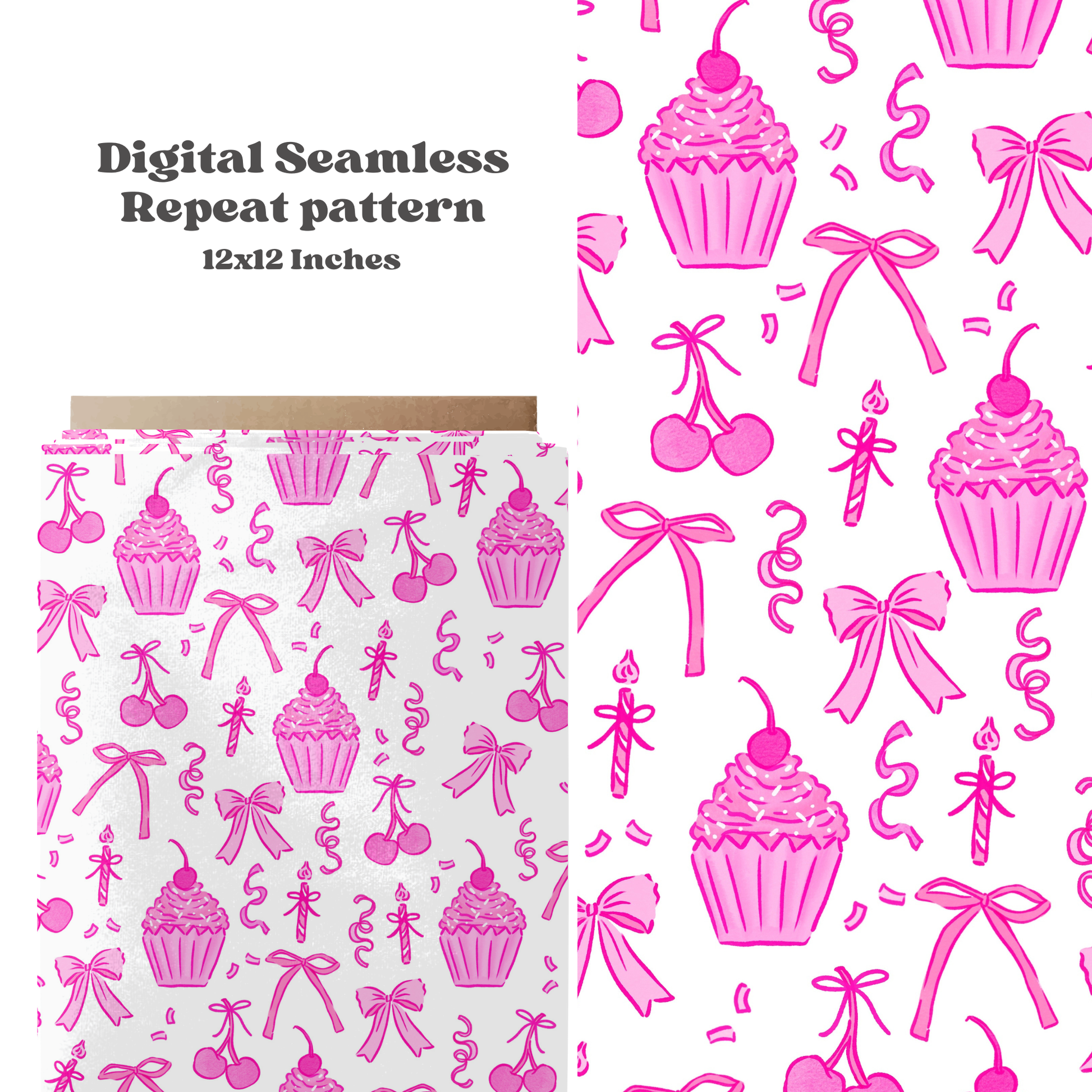 Celebrate in style with this charming digital seamless pattern featuring preppy bows, delightful cupcakes, confetti, and birthday candles rendered in soft watercolor. Perfect for birthday invitations, party decorations, wrapping paper, and creative projects. This downloadable design repeats seamlessly, making it ideal for printing, crafting, and digital applications. Bring festive flair to your celebrations with this whimsical, colorful pattern.
