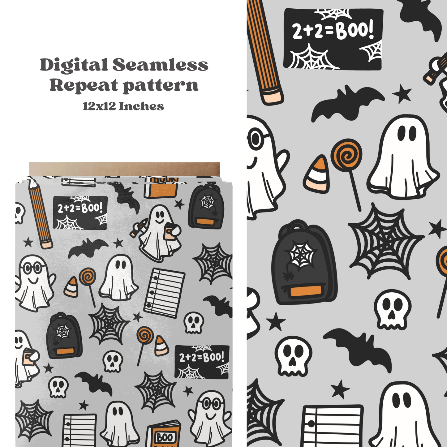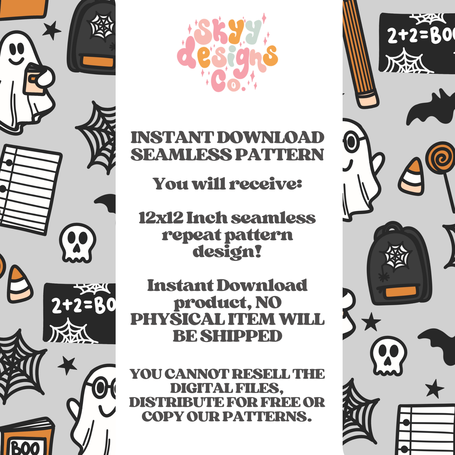 This seamless pattern design features a variety of spooky school supplies, perfect for adding a touch of fun to any fabric or product with a Halloween or back-to-school theme. Available for instant download in JPEG format, this design is perfect for adding a unique touch to your spooky collection.