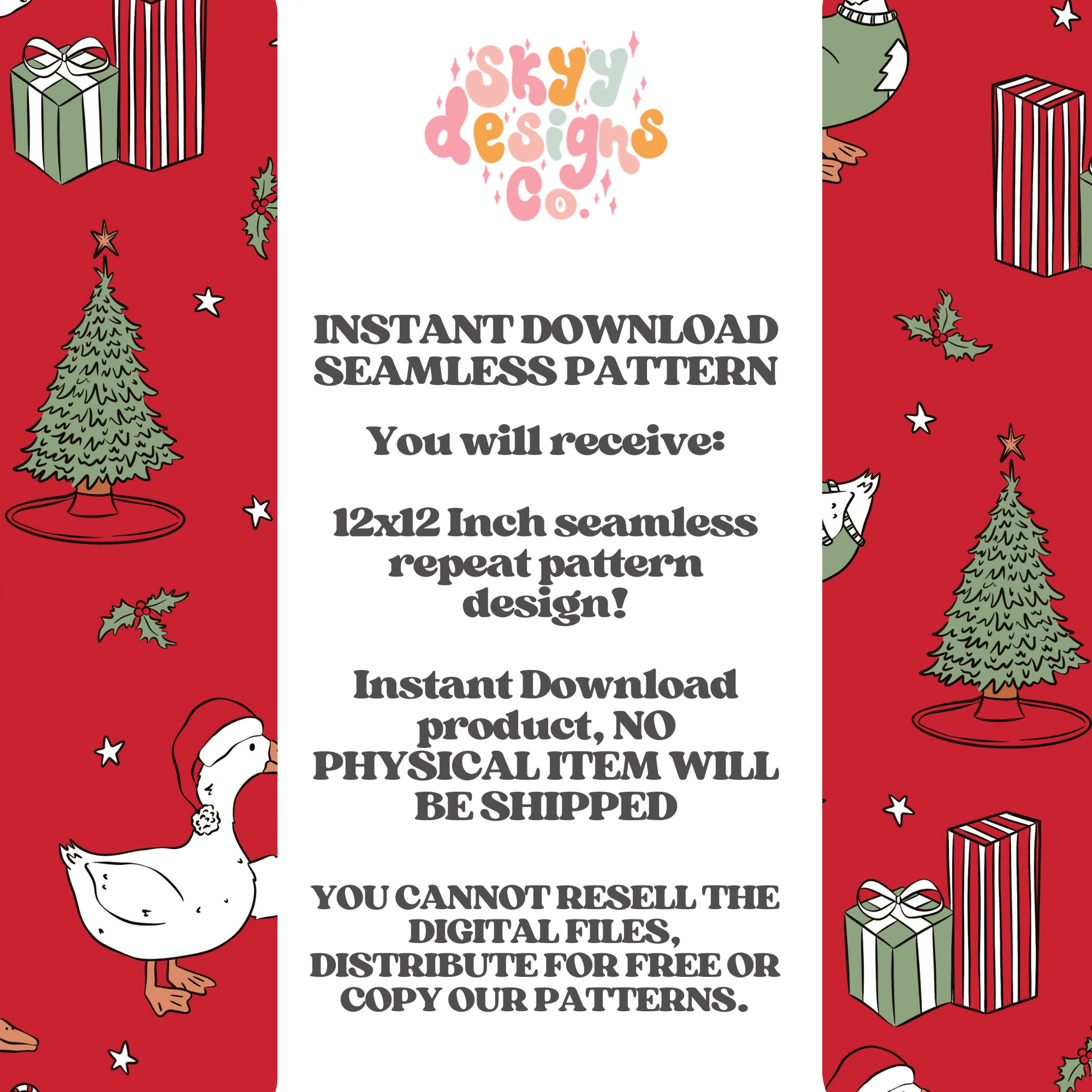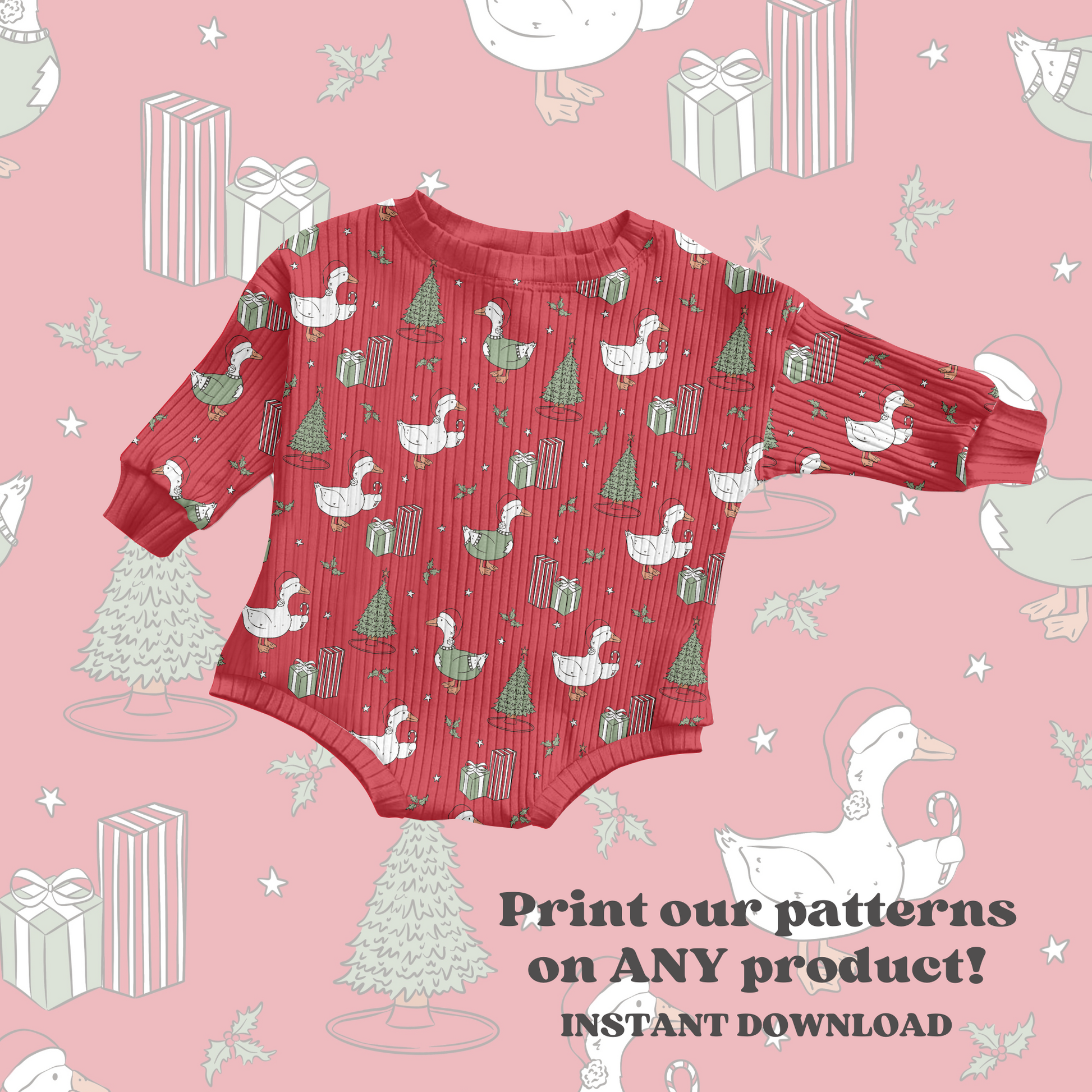 This Christmas ducks seamless repeat pattern offers a delightful, festive design perfect for holiday projects. Available as an instant JPEG download, it can be easily applied to any product, making it ideal for creating joyful items for boys or girls. Add a charming holiday spirit to your crafts, apparel, or decorations with this versatile digital pattern.