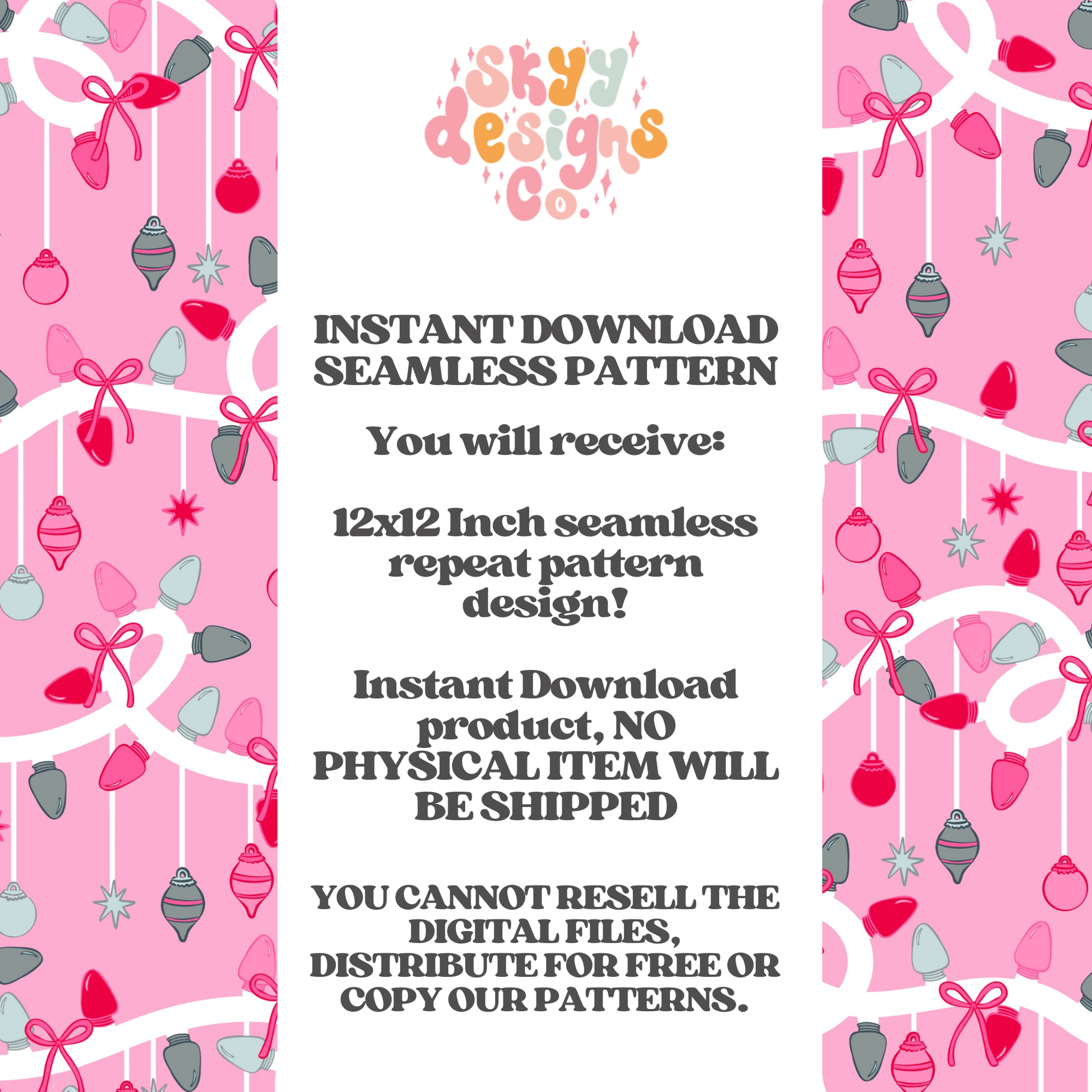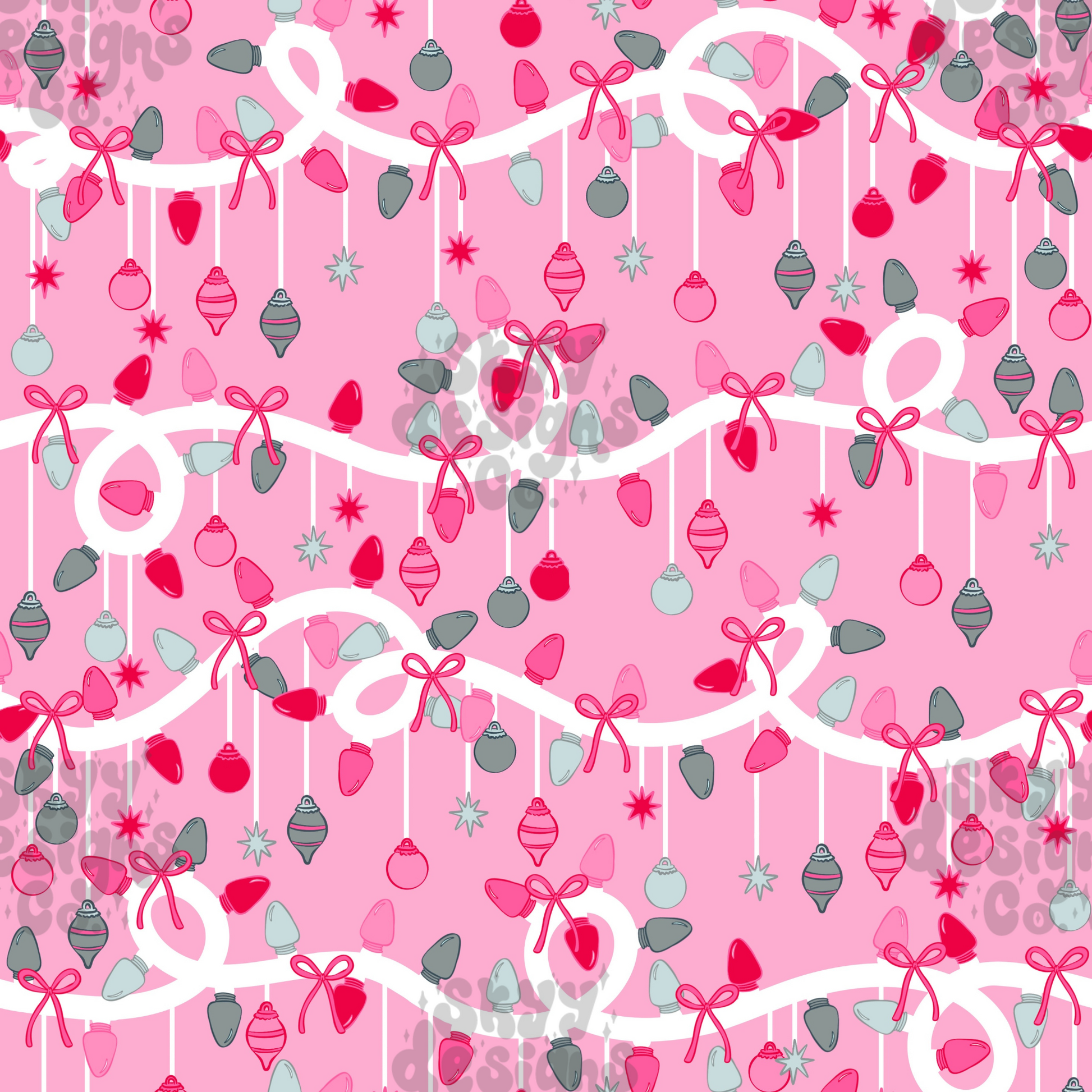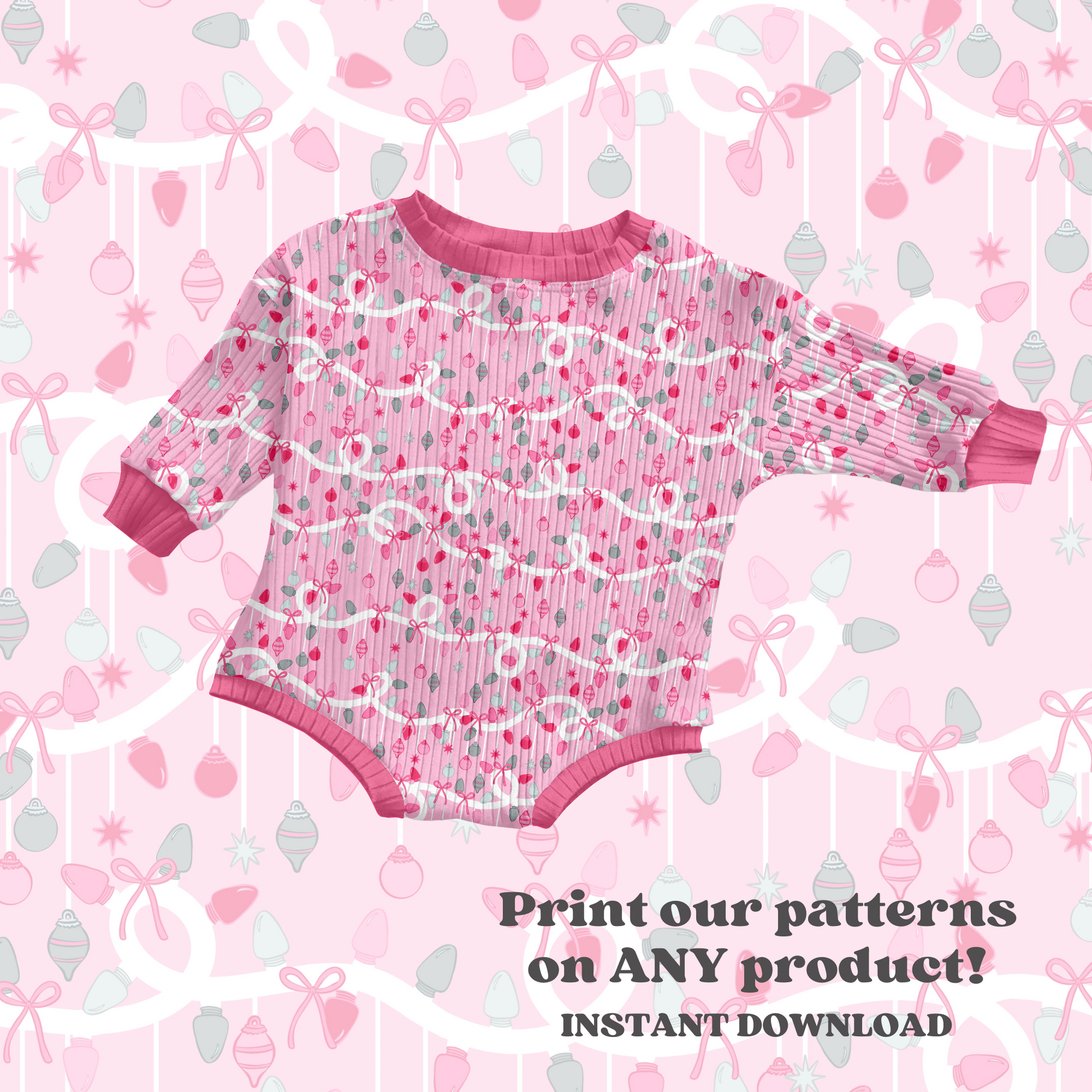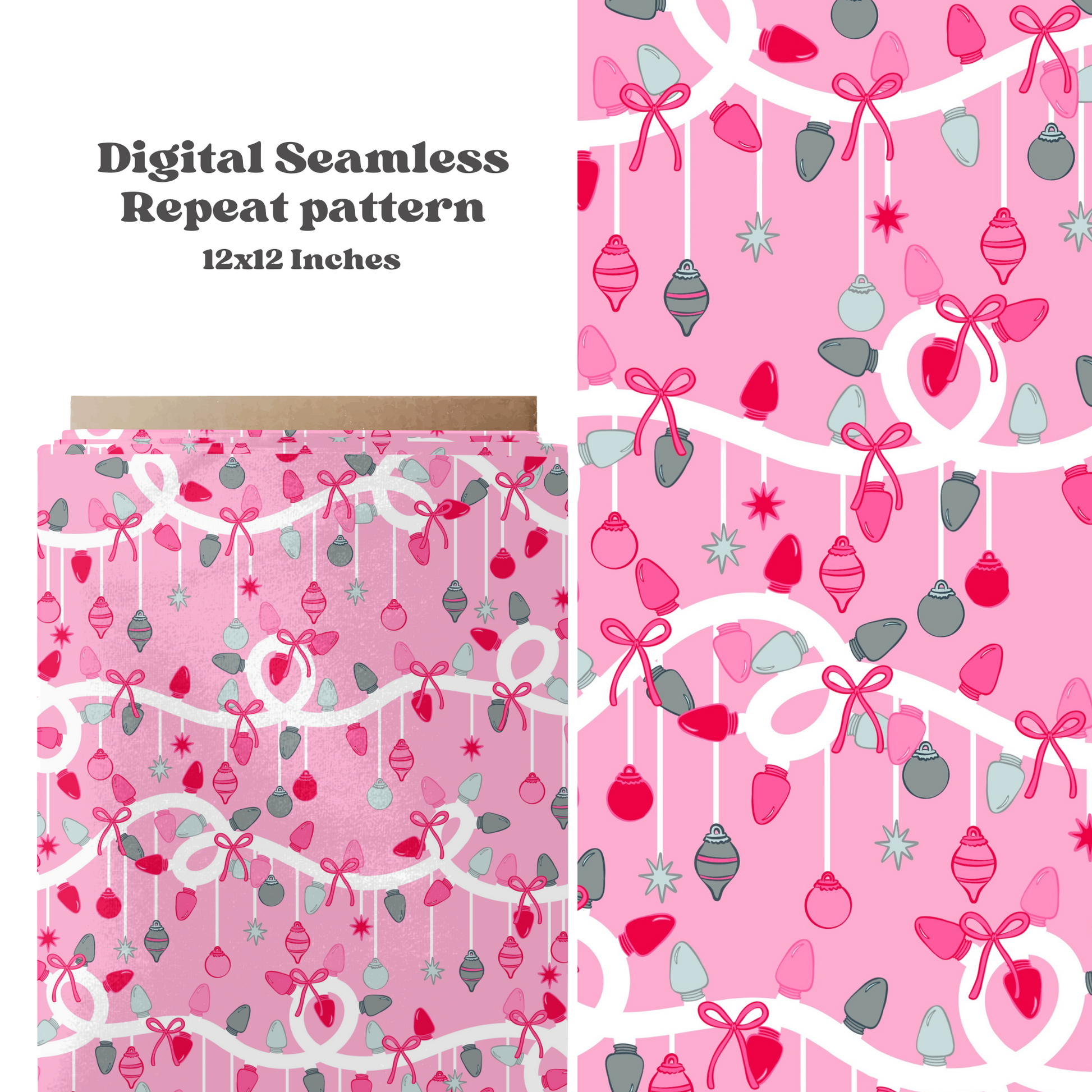 This digital seamless pattern showcases vibrant Christmas lights and ornaments against a bright pink background. Available for instant download in JPEG format, it’s perfect for adding a festive, colorful touch to any product.