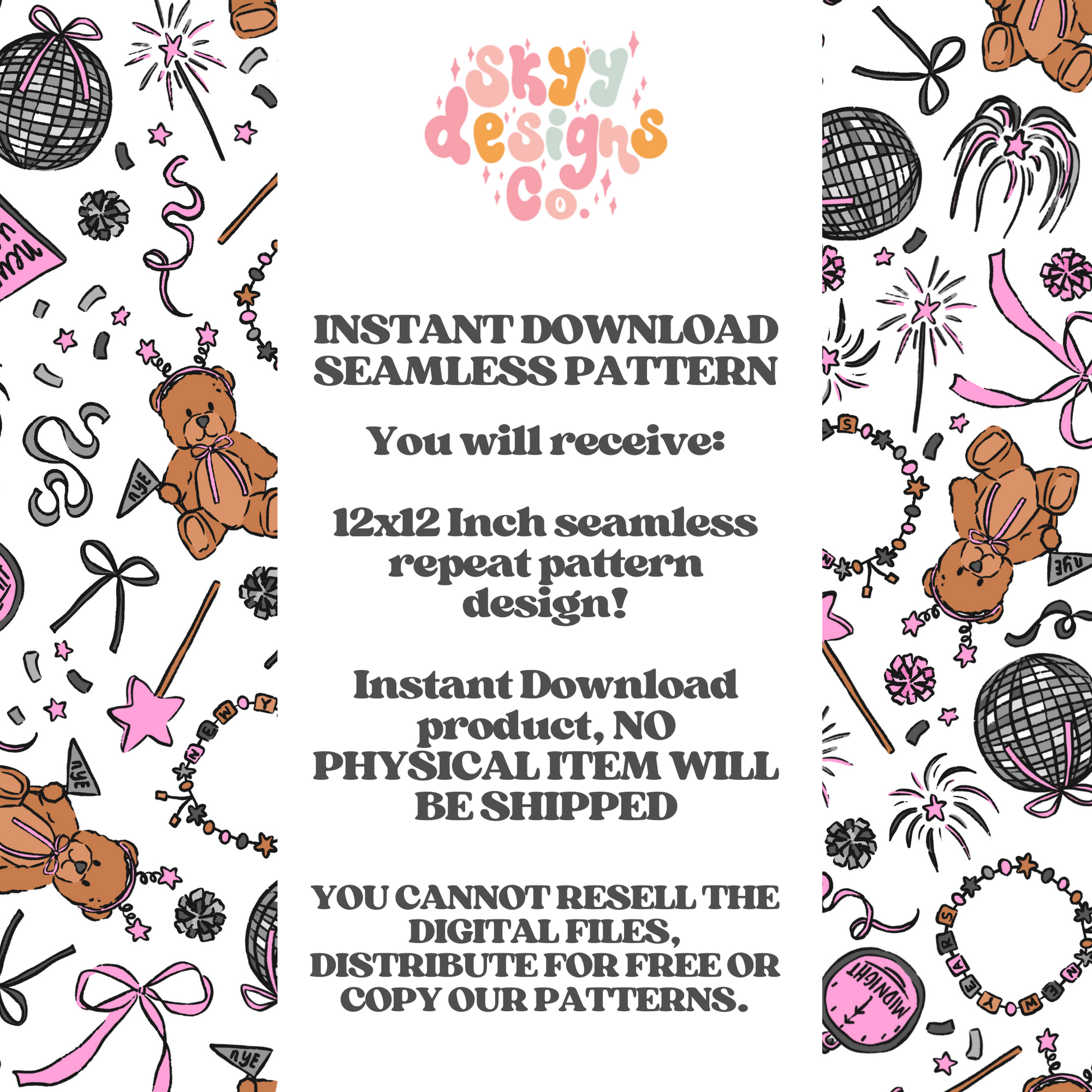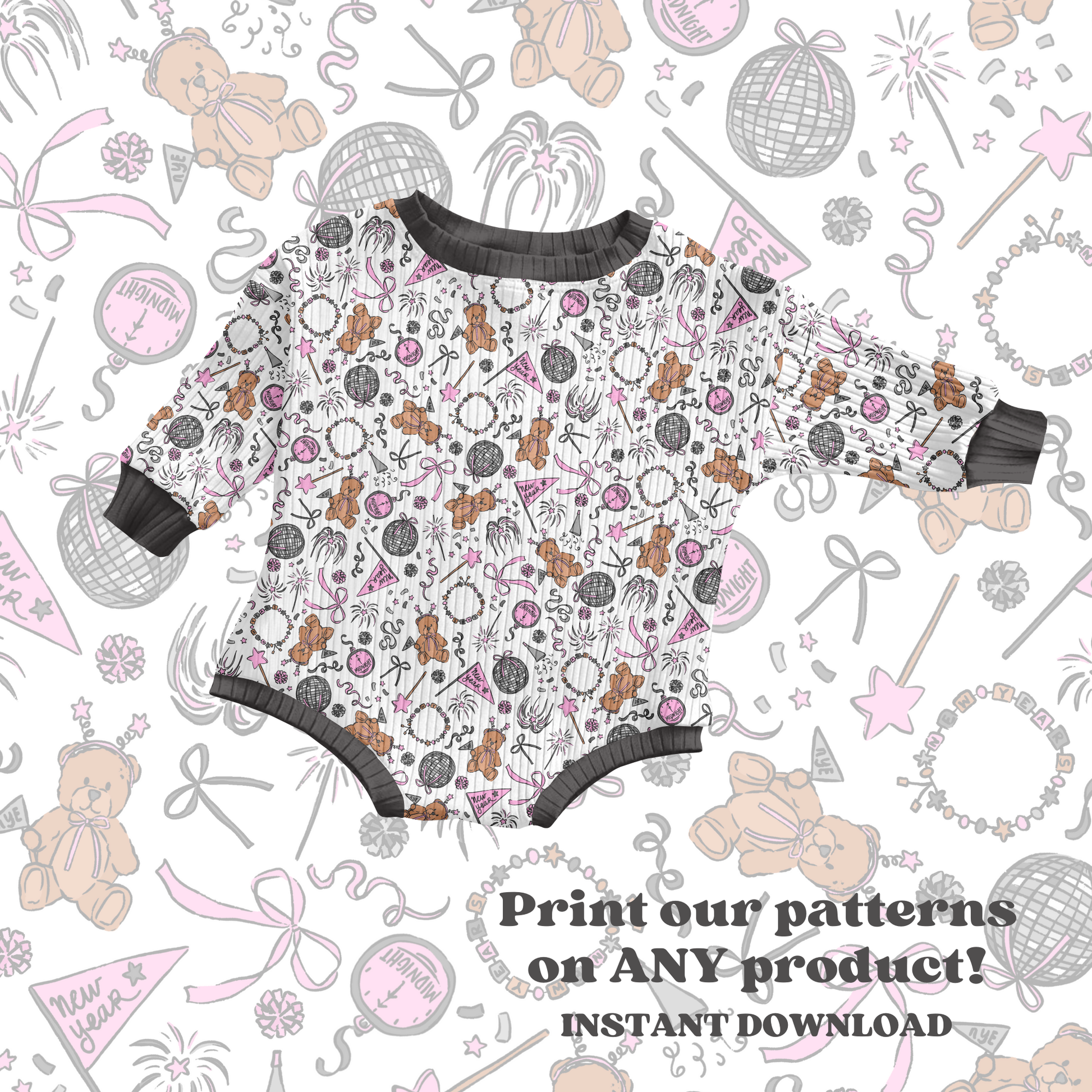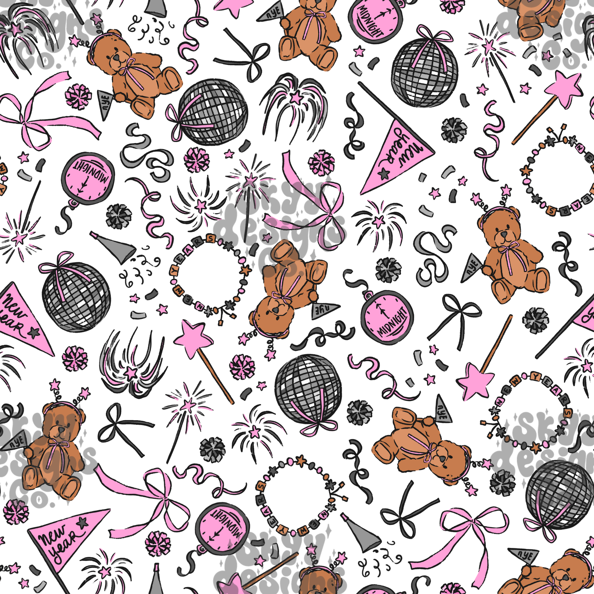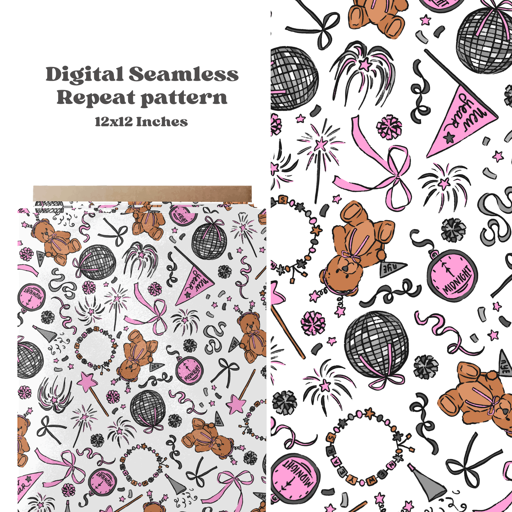 Celebrate New Year's in style with this Preppy New Years Bears seamless pattern. Instantly downloadable in JPEG format, it features playful bears, disco balls, bows, confetti, clocks, and fireworks. Ideal for adding a festive touch to any product or project, this design brings a fun and lively vibe to your New Year's celebrations.