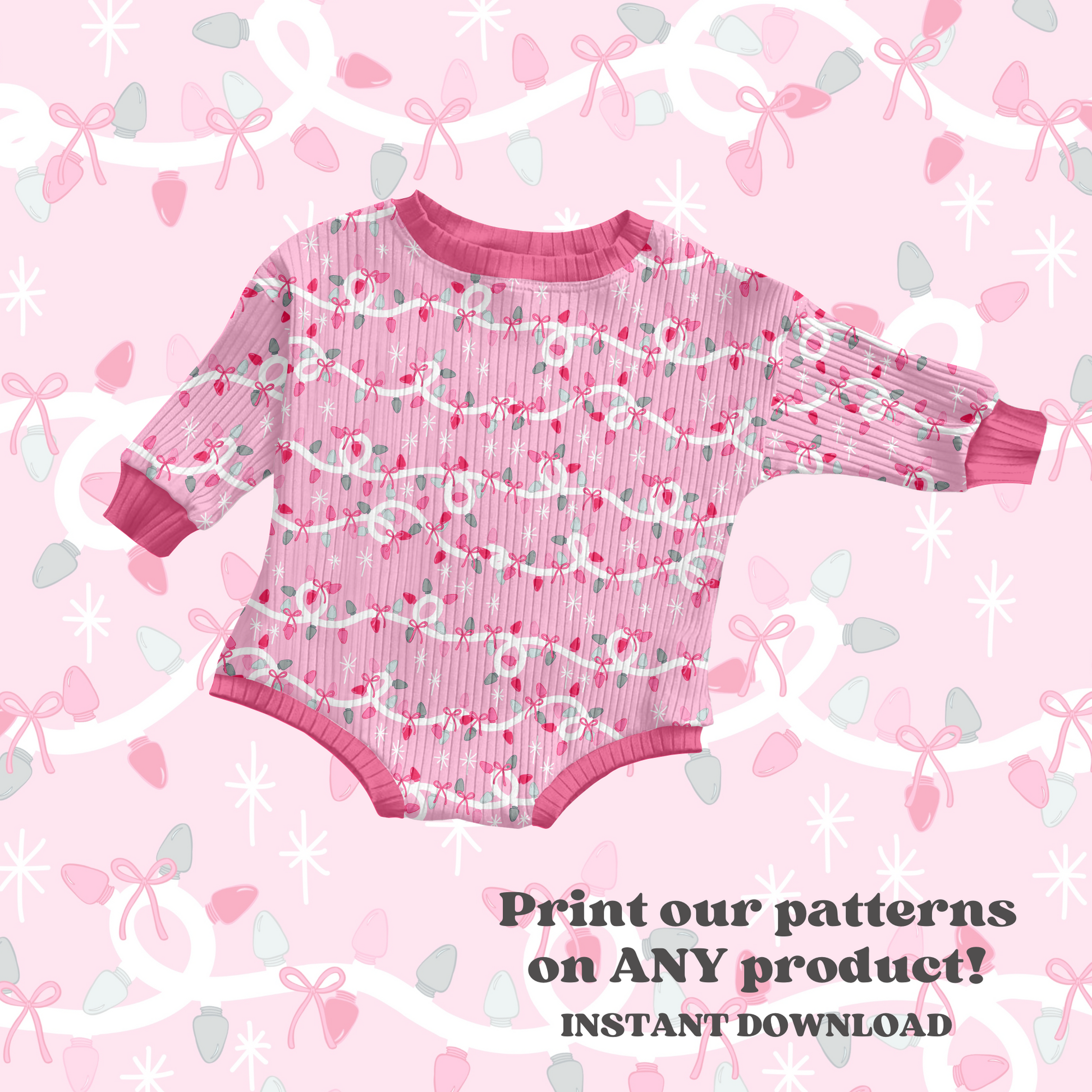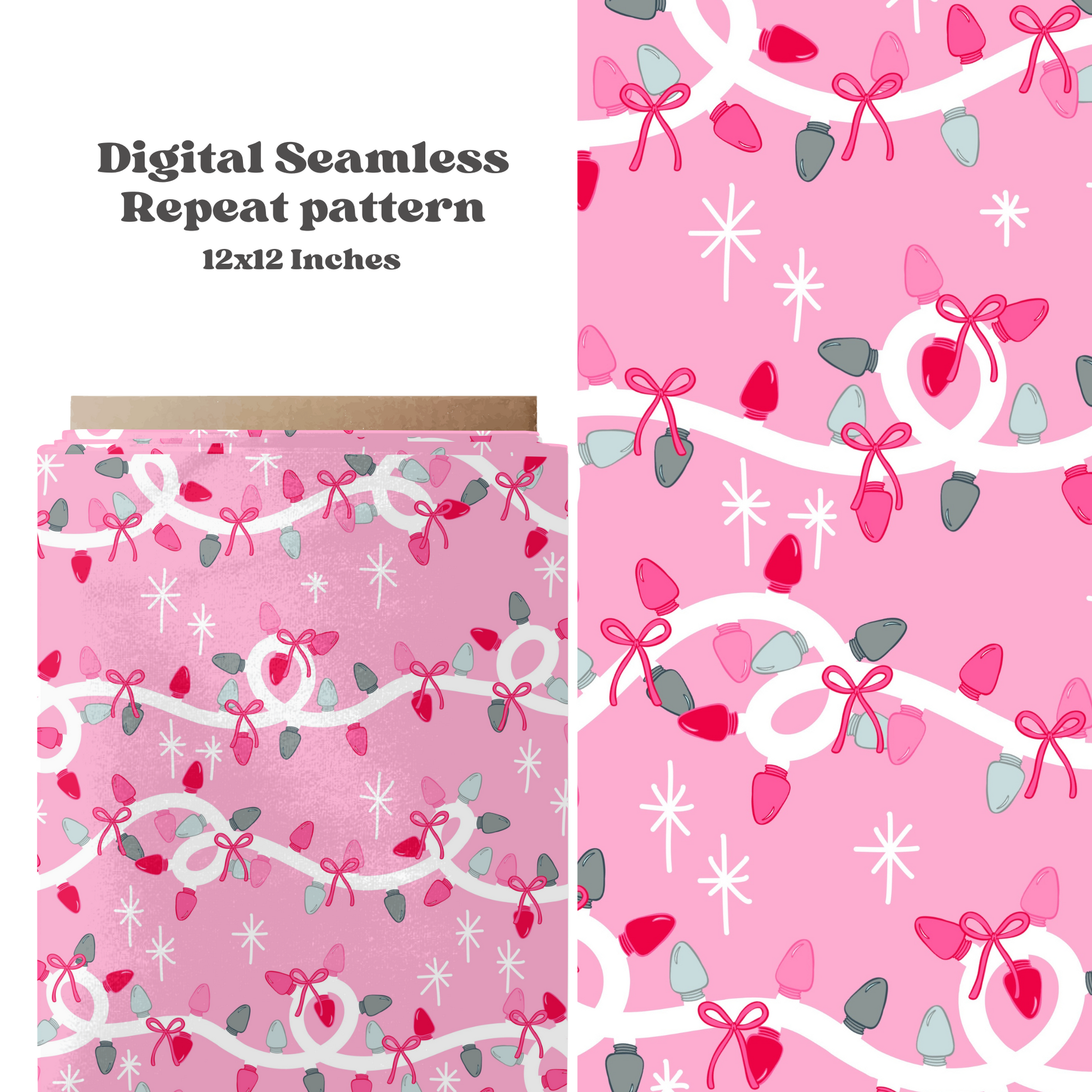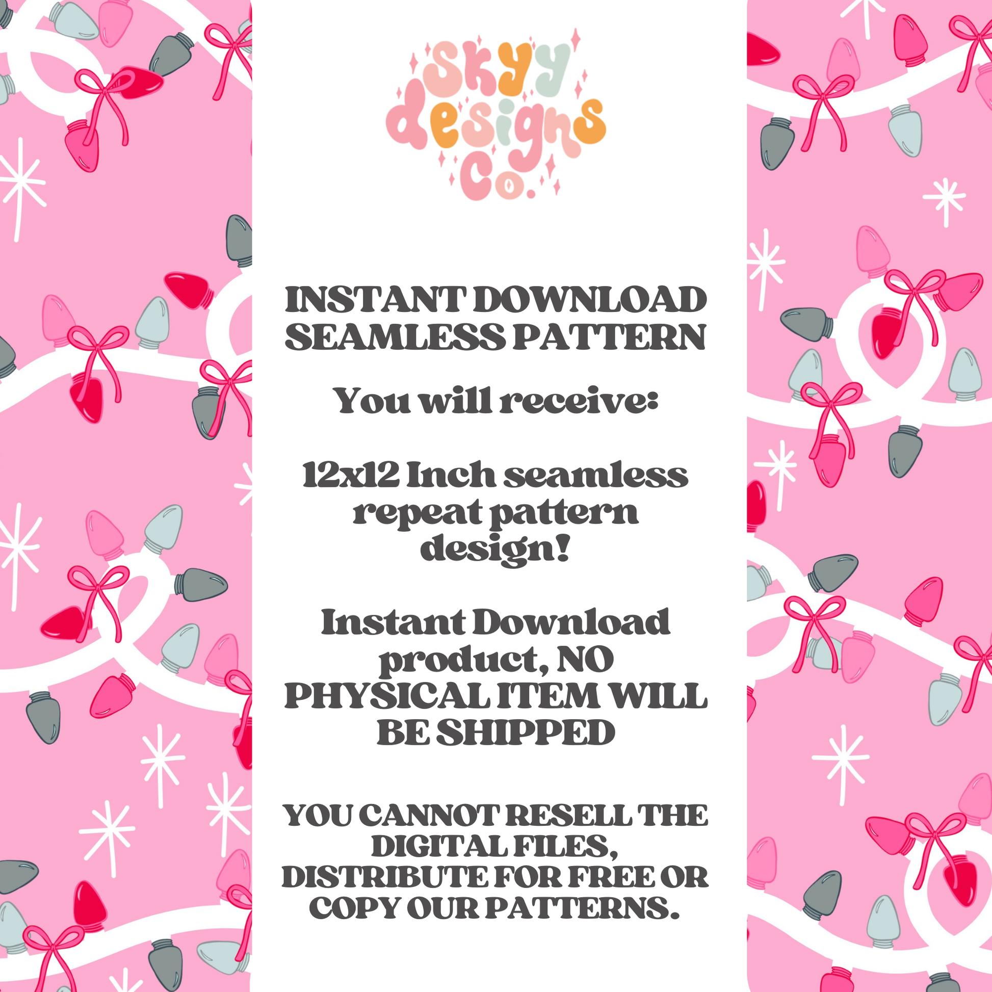 Brighten your holiday projects with this Preppy Pink Christmas Lights digital seamless pattern. Featuring charming Christmas lights adorned with bows against a vivid pink background, this high-quality JPEG design is perfect for instantly downloading and applying to a variety of products. Add a playful and festive touch to your crafts, textiles, or digital creations with this cheerful pattern.