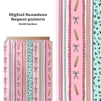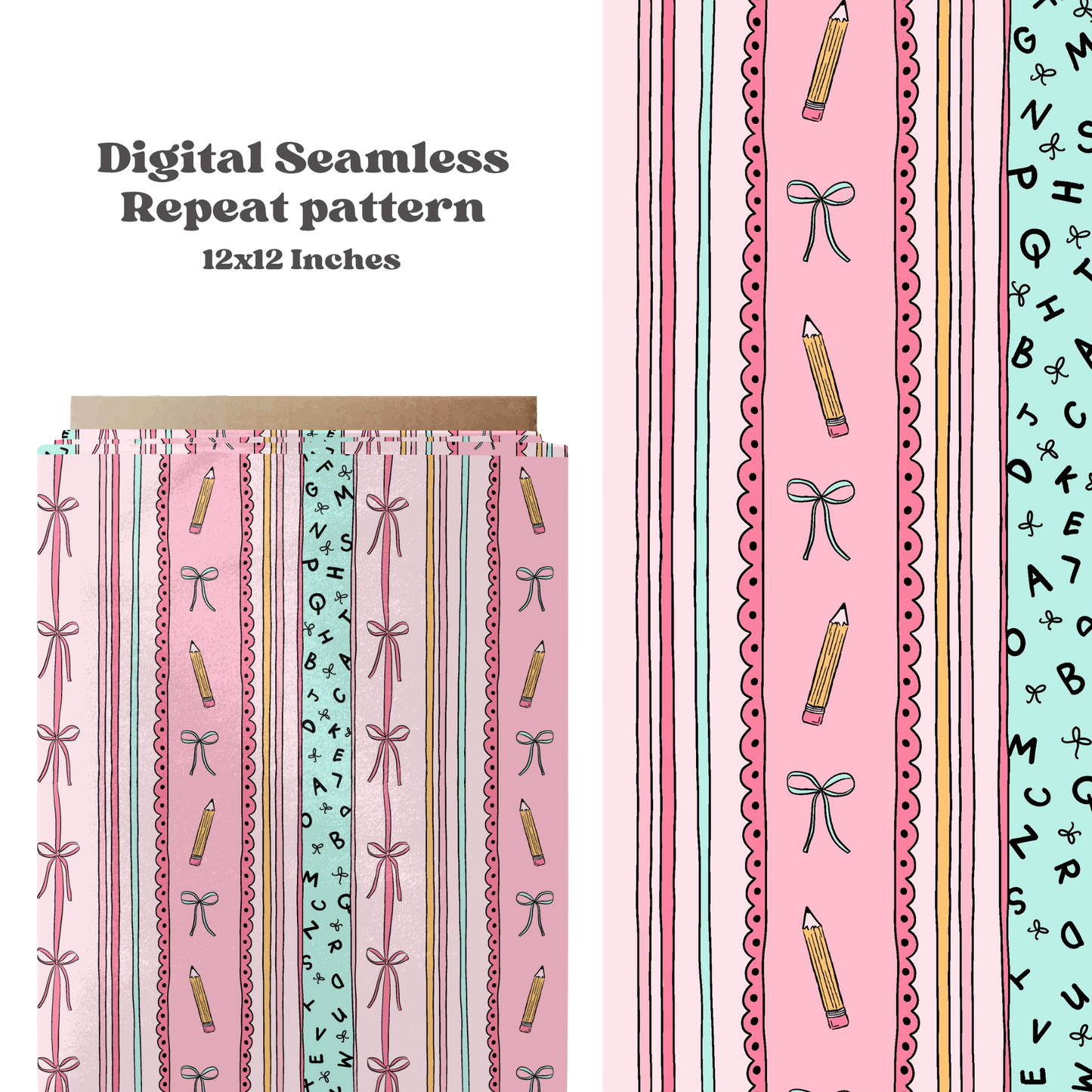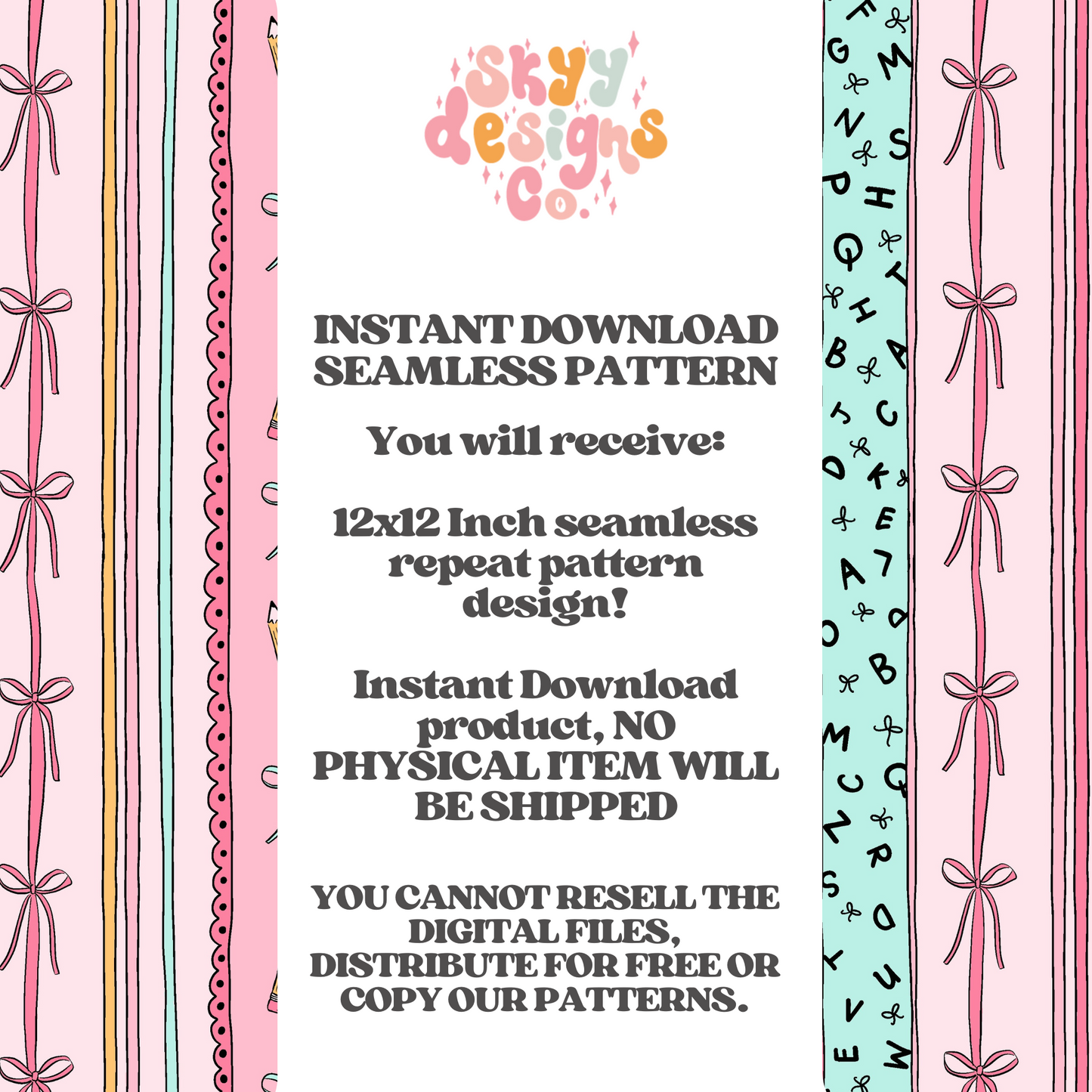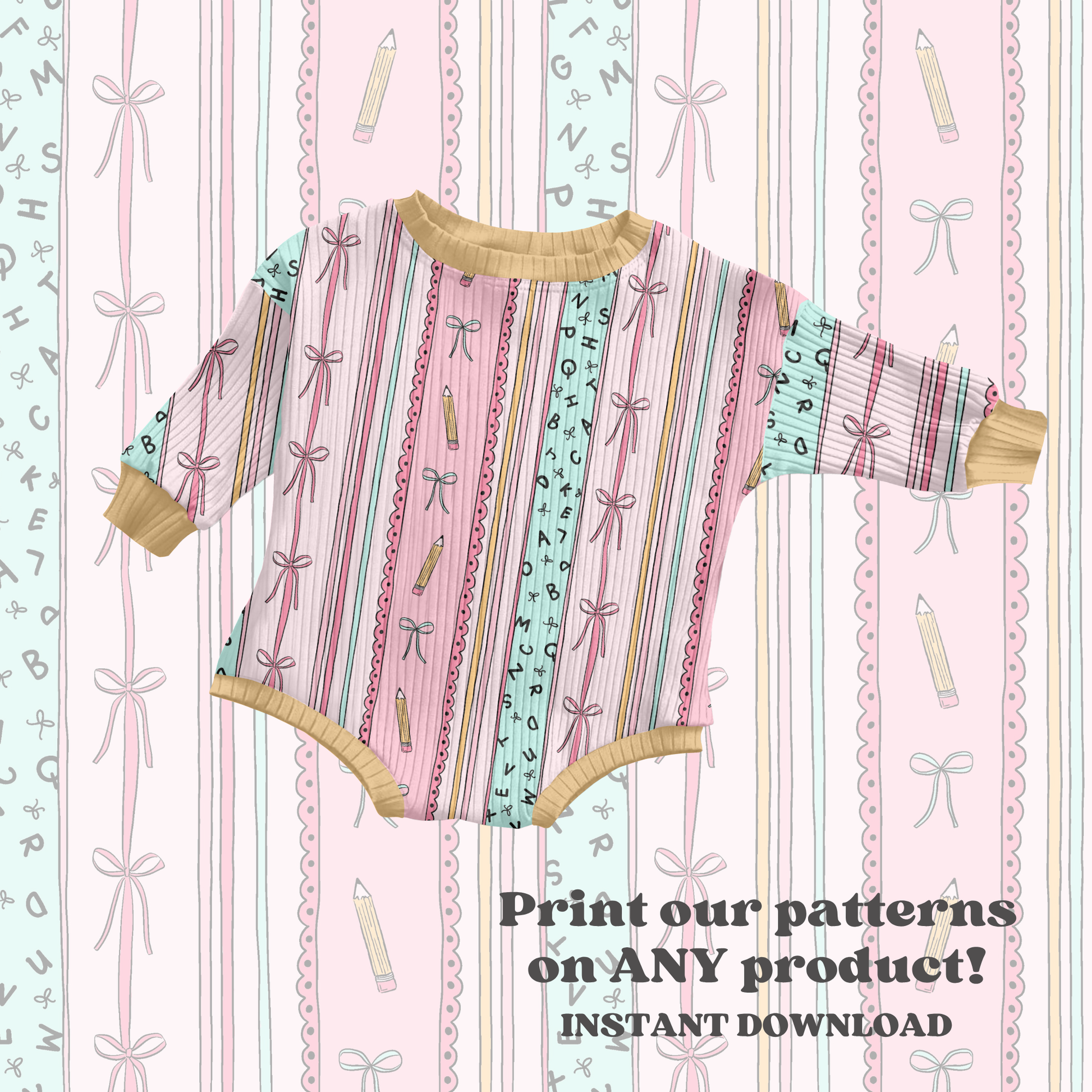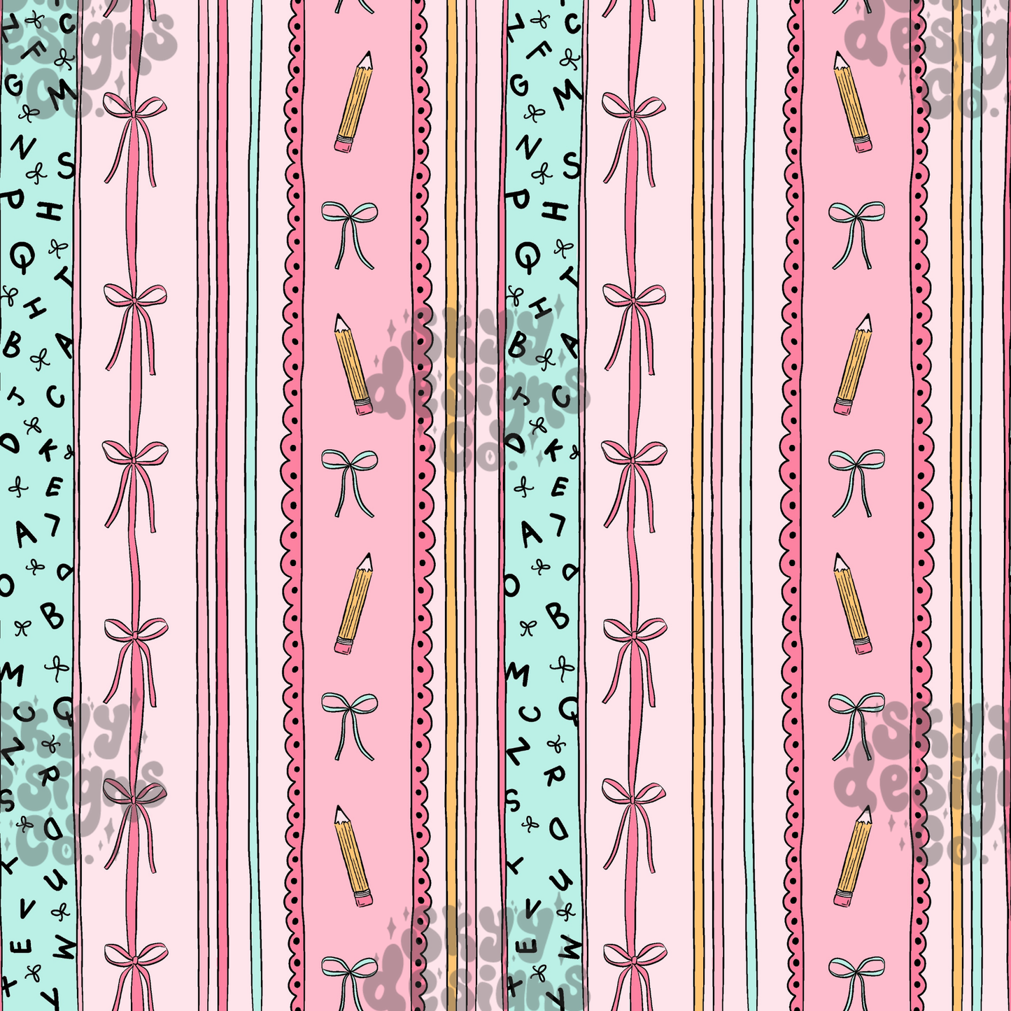 The Coquette girly school stripes seamless pattern in JPEG format is perfect for adding a cute, feminine touch to back-to-school products. Featuring bows, pencils, and alphabet letters in a stripe style, this pattern is ready for instant download and easy application on any item.
