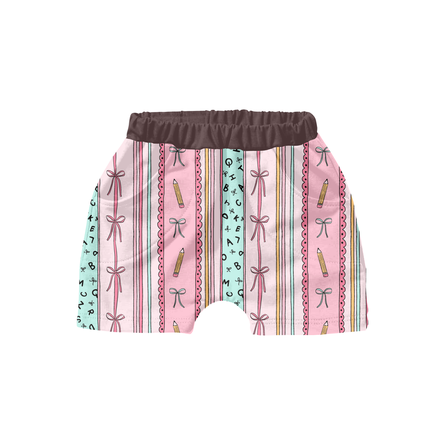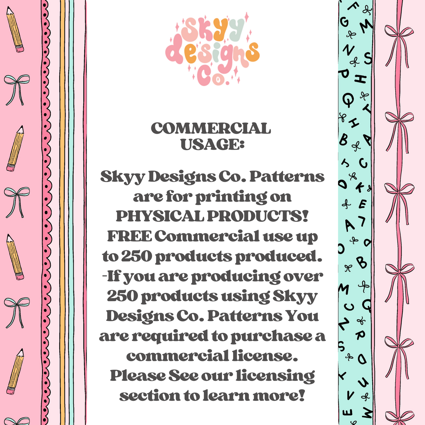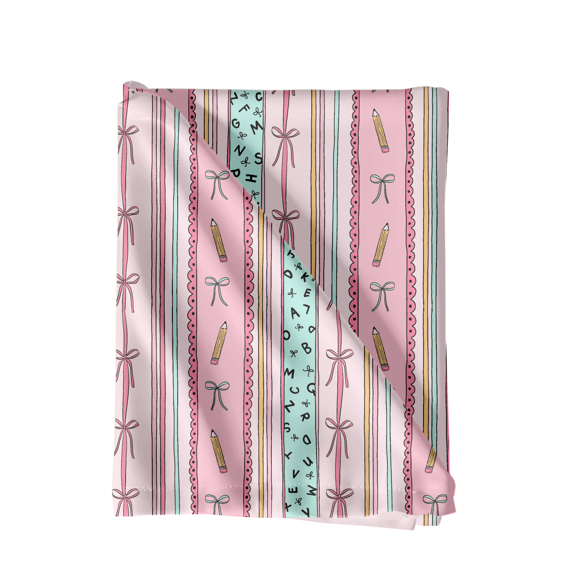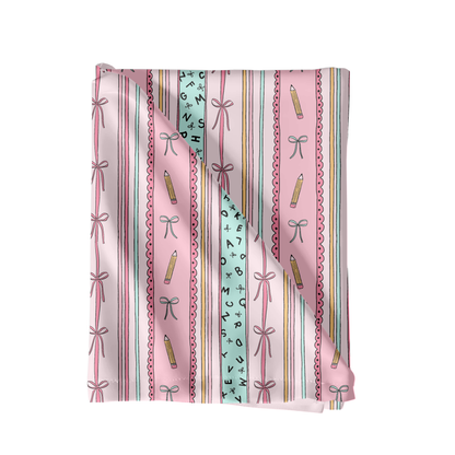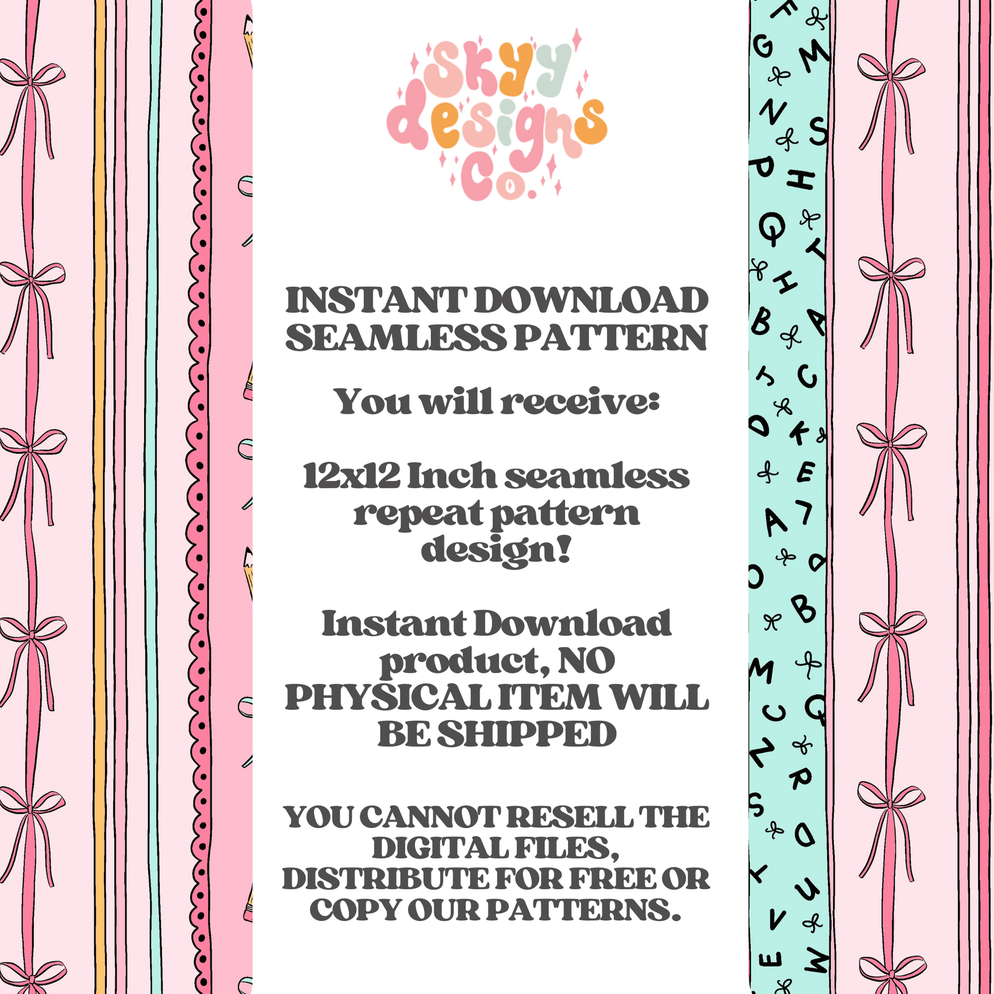 The Coquette girly school stripes seamless pattern in JPEG format is perfect for adding a cute, feminine touch to back-to-school products. Featuring bows, pencils, and alphabet letters in a stripe style, this pattern is ready for instant download and easy application on any item.