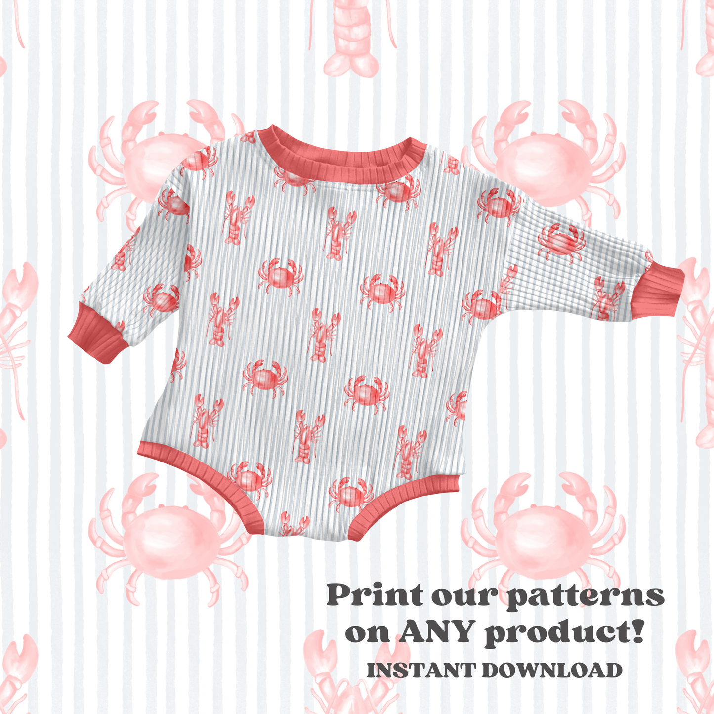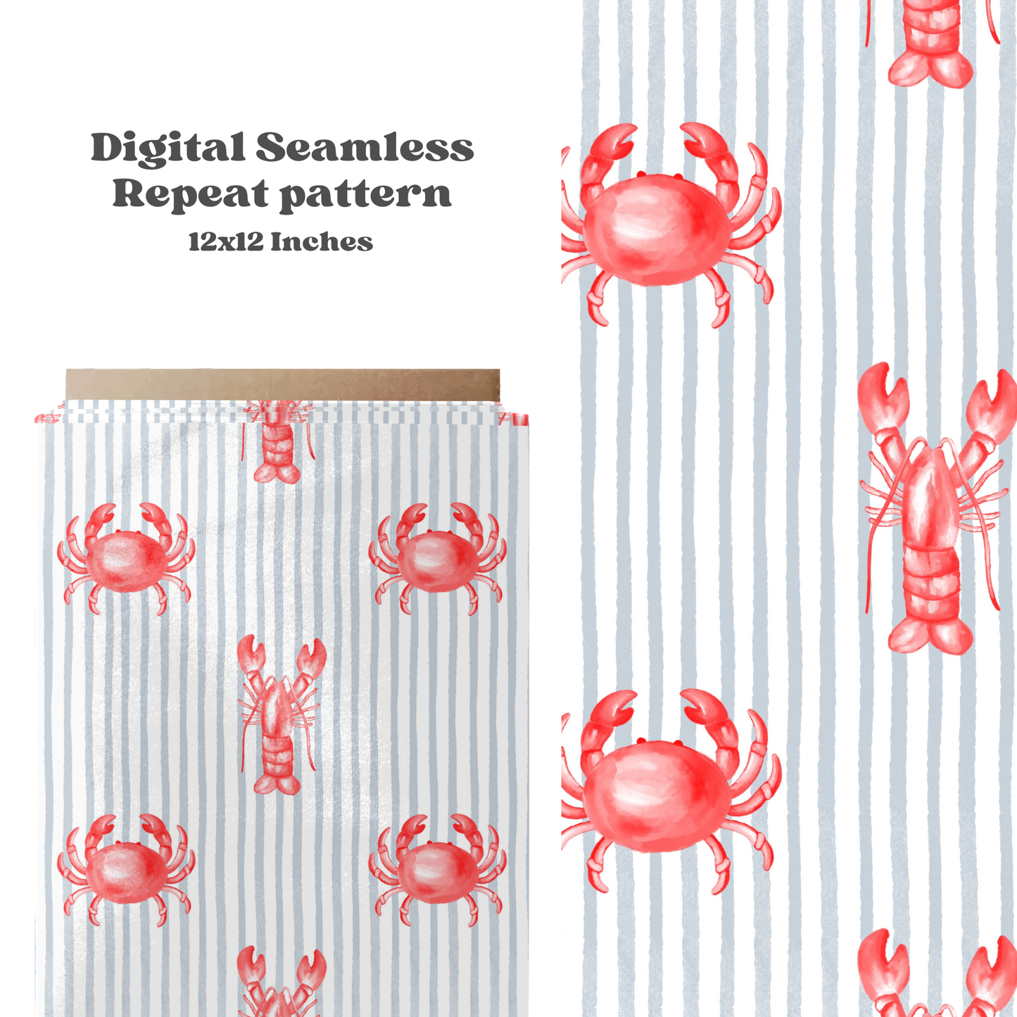 This nautical gender neutral seamless pattern features watercolor crabs and lobsters on a blue stripe background, perfect for boys and girls during the summer season.