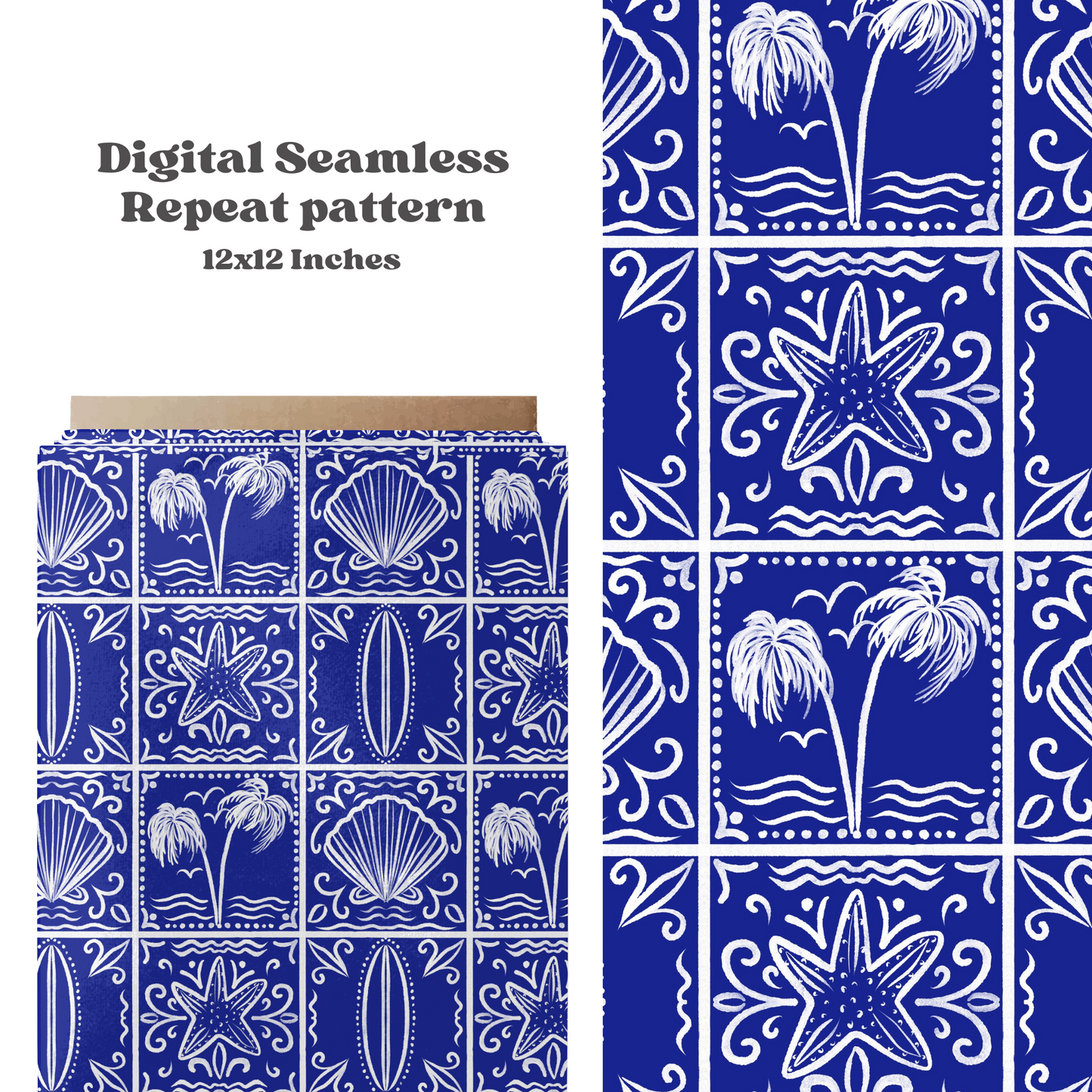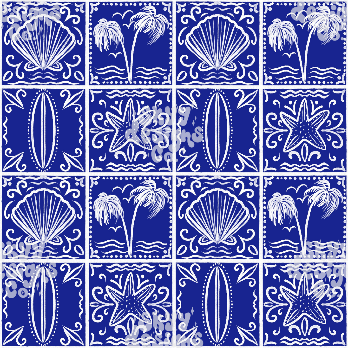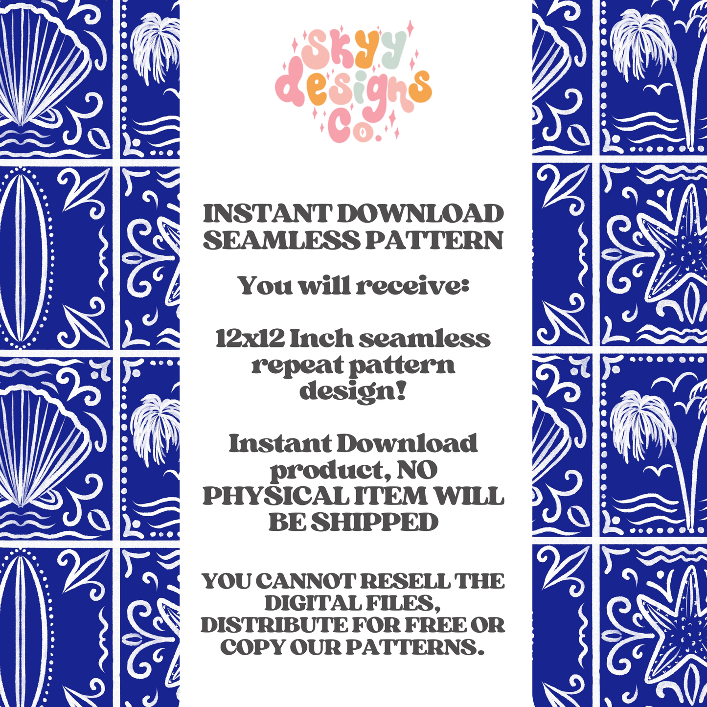 This seamless tile pattern in JPEG format features a modern Mediterranean style with a nautical touch. With starfish, surfboards, shells, and palm trees in a Seville Tile design, it will bring any summer product to life. Instant download for easy use.
