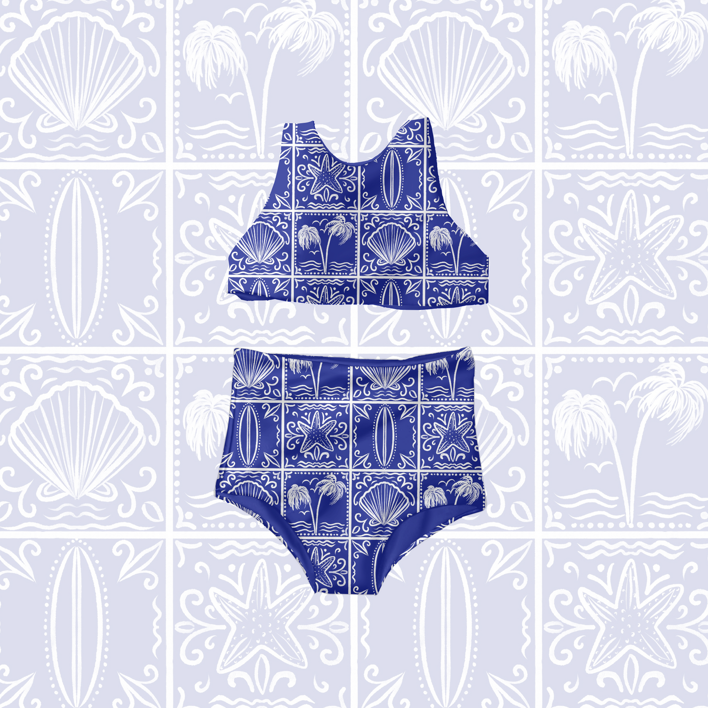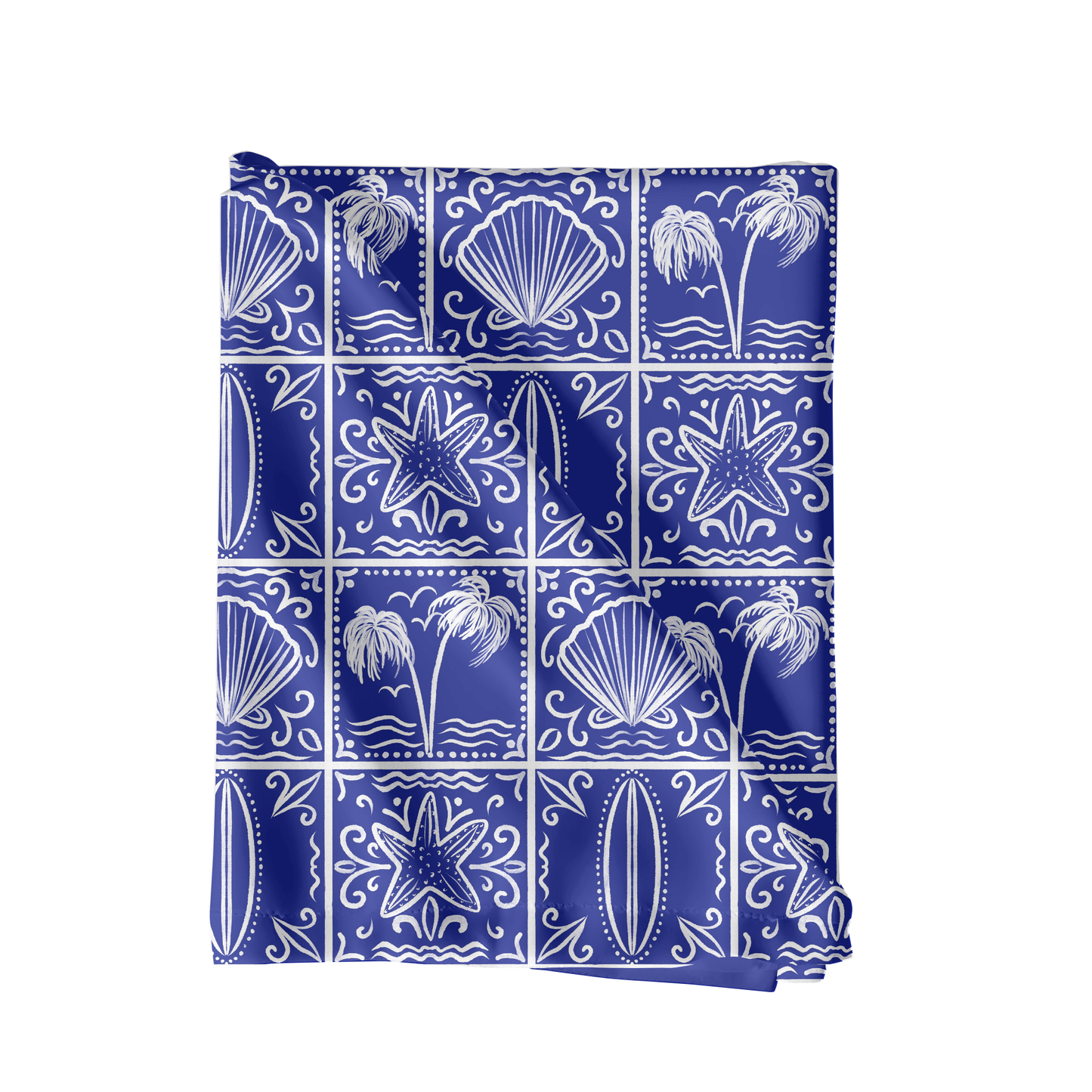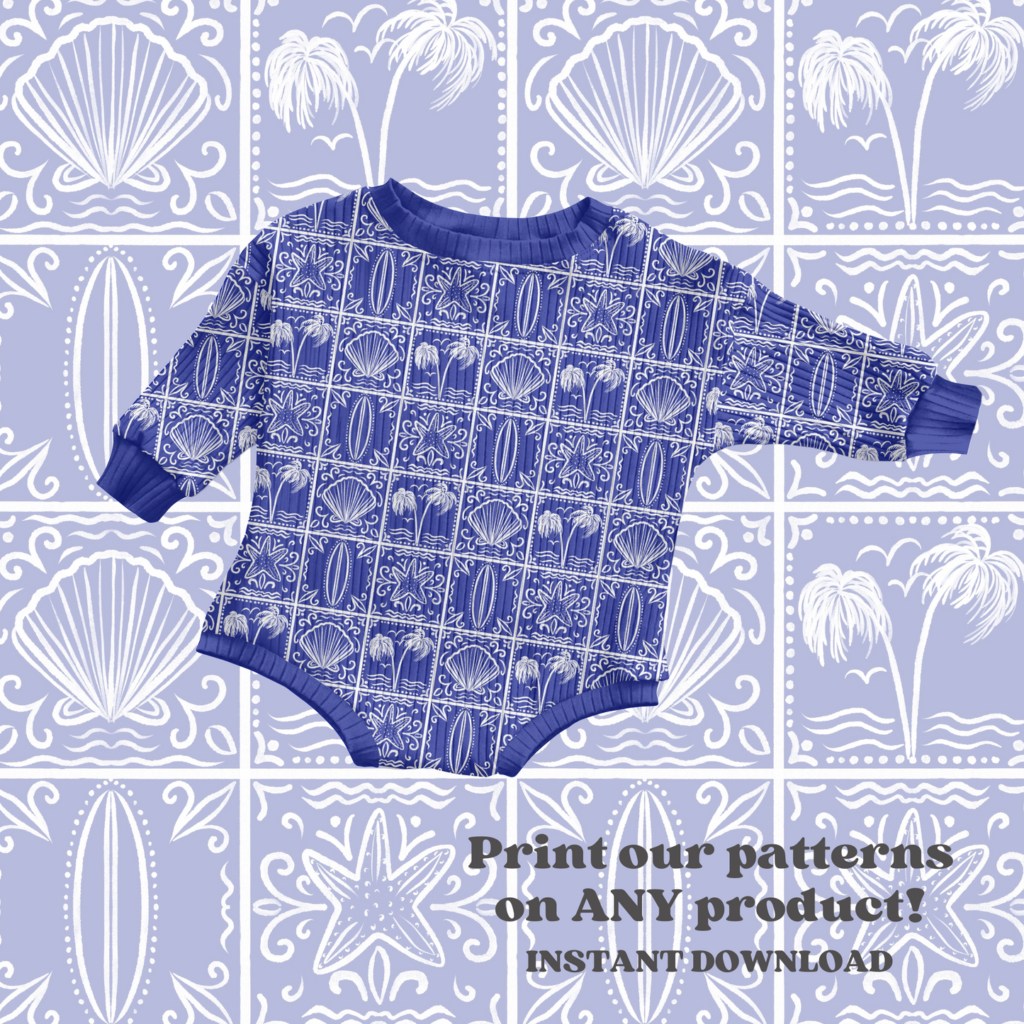 This seamless tile pattern in JPEG format features a modern Mediterranean style with a nautical touch. With starfish, surfboards, shells, and palm trees in a Seville Tile design, it will bring any summer product to life. Instant download for easy use.