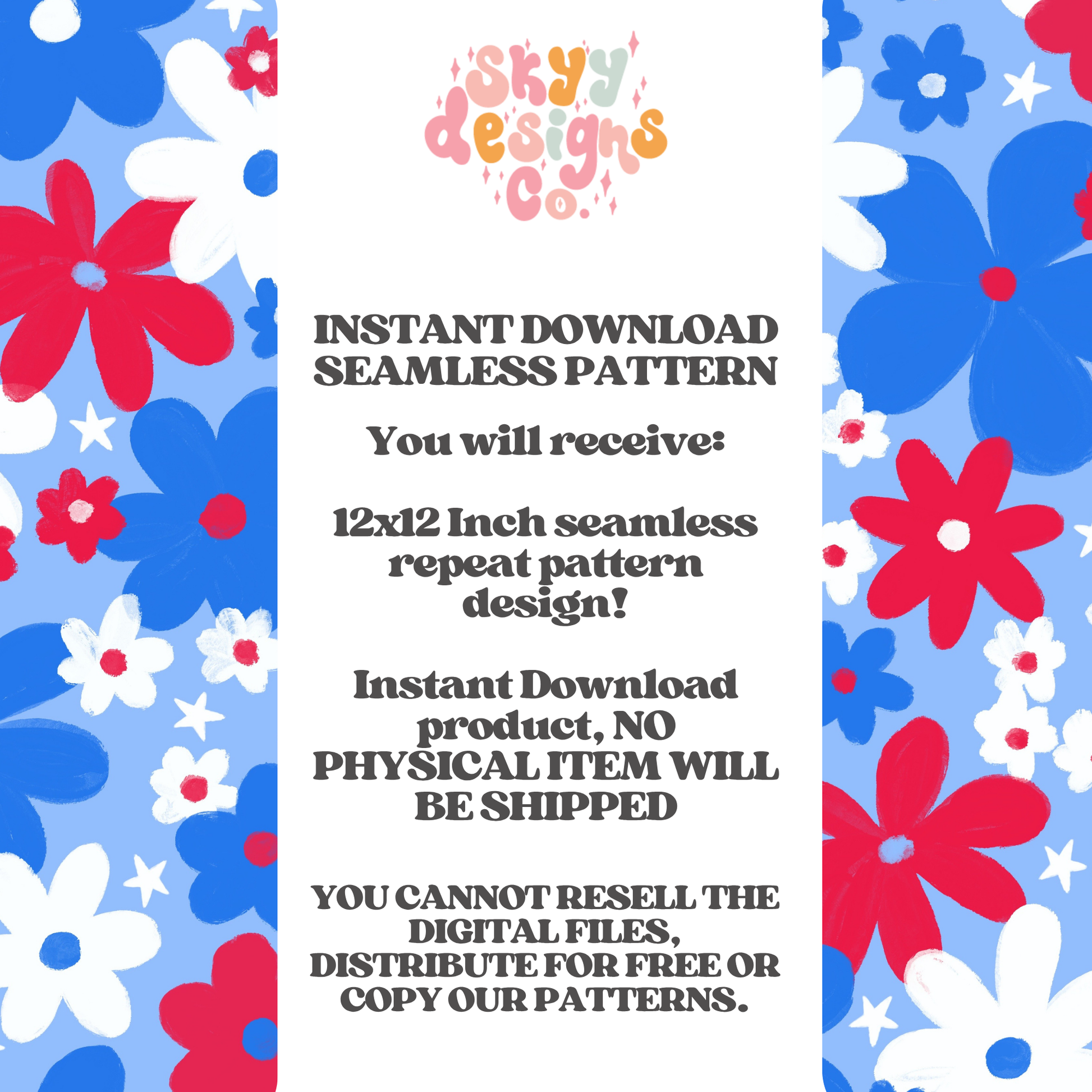 Patriotic Daisy digital seamless pattern design — perfect for Fourth of July season! This vibrant seamless pattern features bright red, white, and blue daisies set against a stunning blue background, ready to download and apply instantly to any product. Ideal for printing on swimsuits, clothing, home décor, and all your patriotic creations.