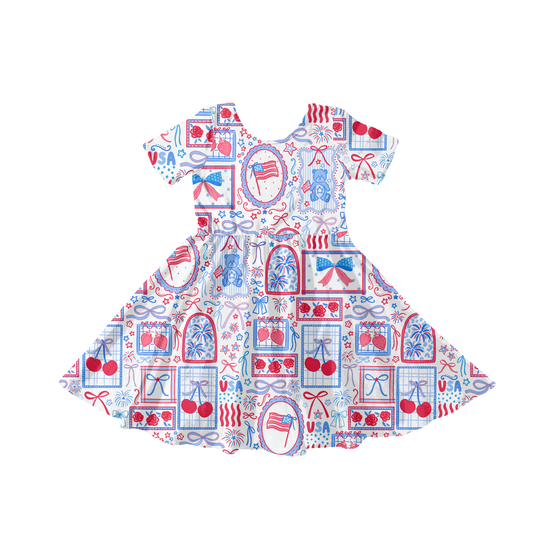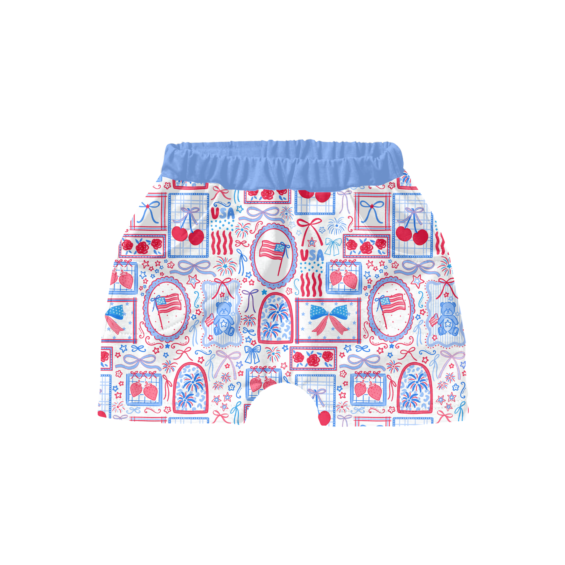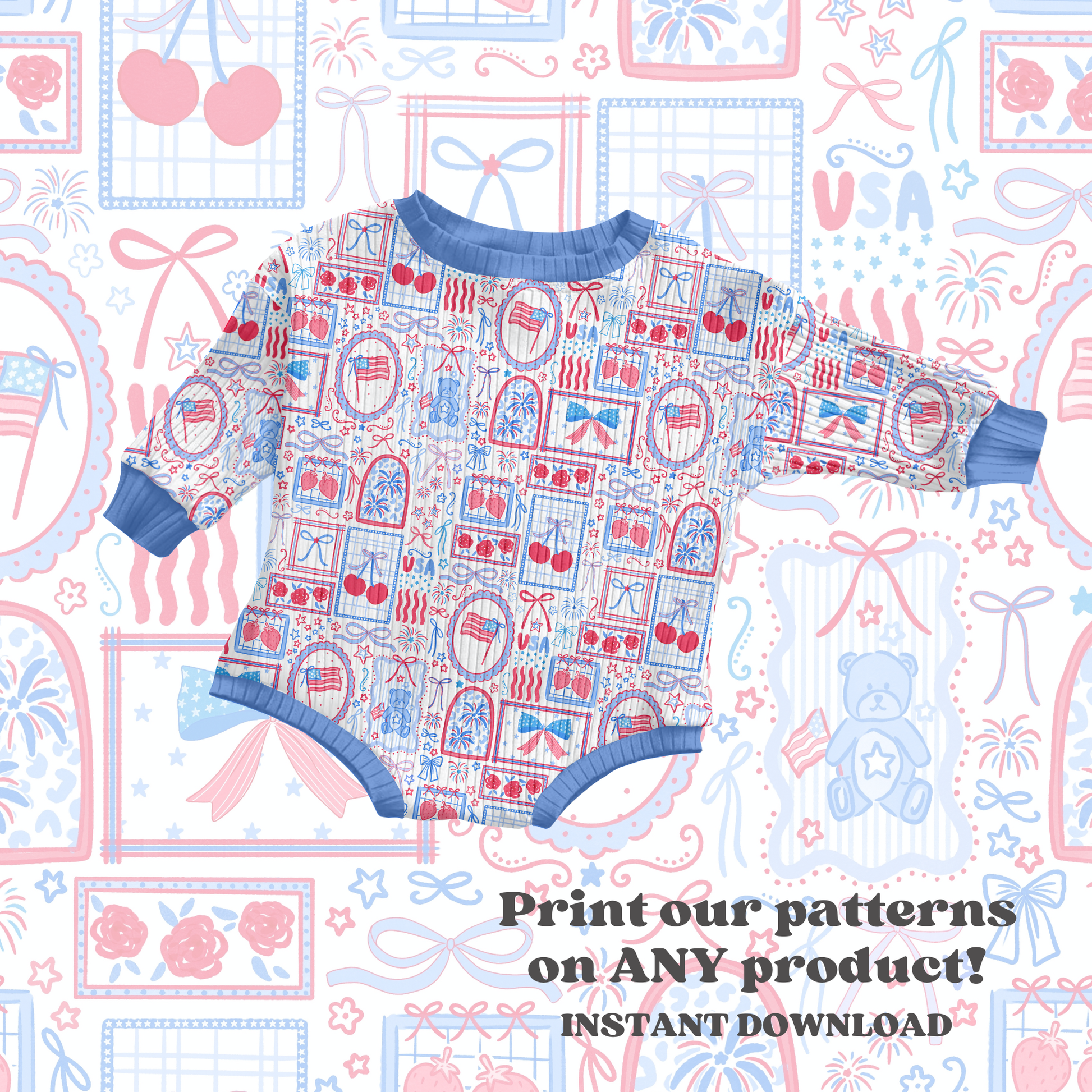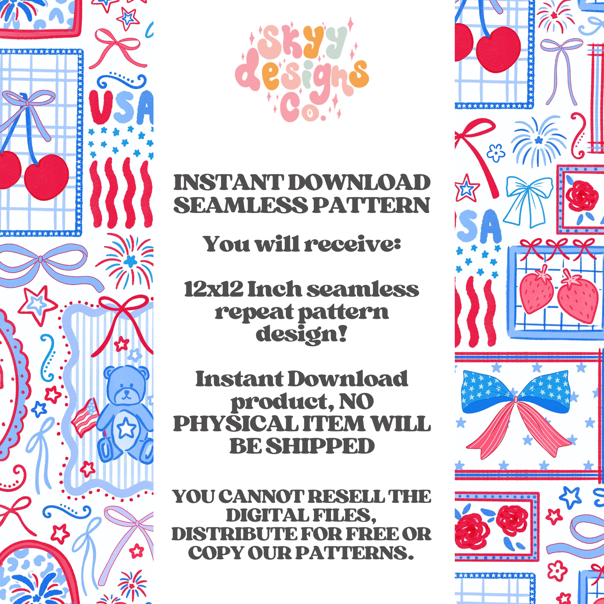 Celebrate the Fourth of July with this vibrant preppy patriotic stamps seamless pattern design. Download instantly and apply to any product—perfect for custom apparel, home décor, printed goods, and seasonal merchandise. This charming design features preppy bows, adorable bears, fresh cherries, and classic flags arranged in a playful stamp-style aesthetic.