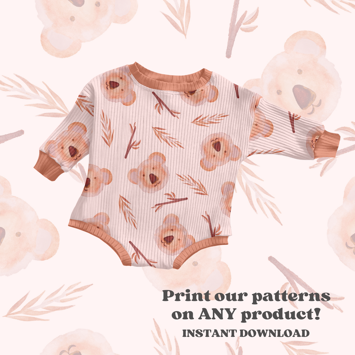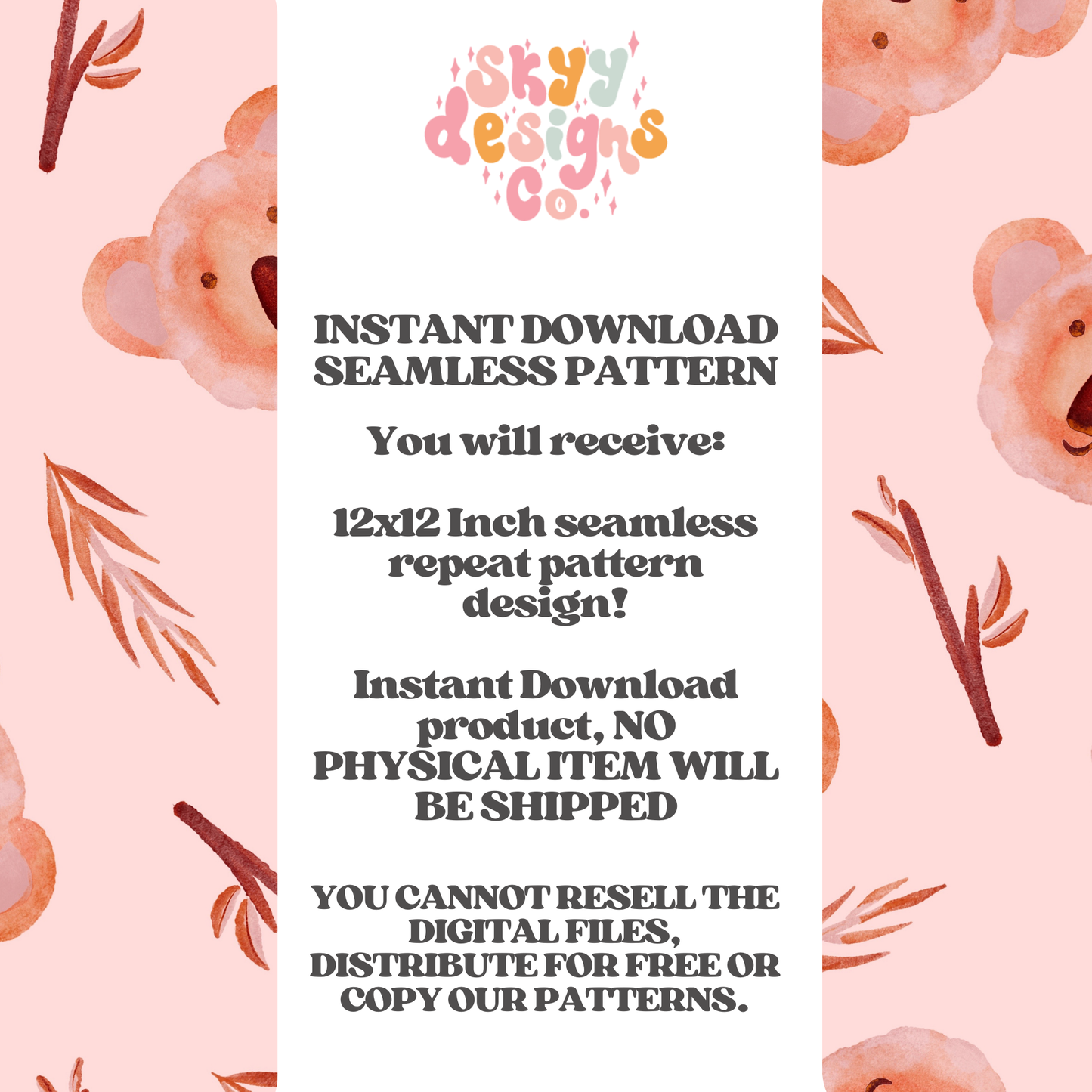 Create stunning products with our Pink Watercolor Koala Seamless Pattern. This high-quality JPEG design is perfect for girl nurseries or adding a touch of summer to any outfit. Easily downloadable for instant use, let your creativity run wild and start creating today.