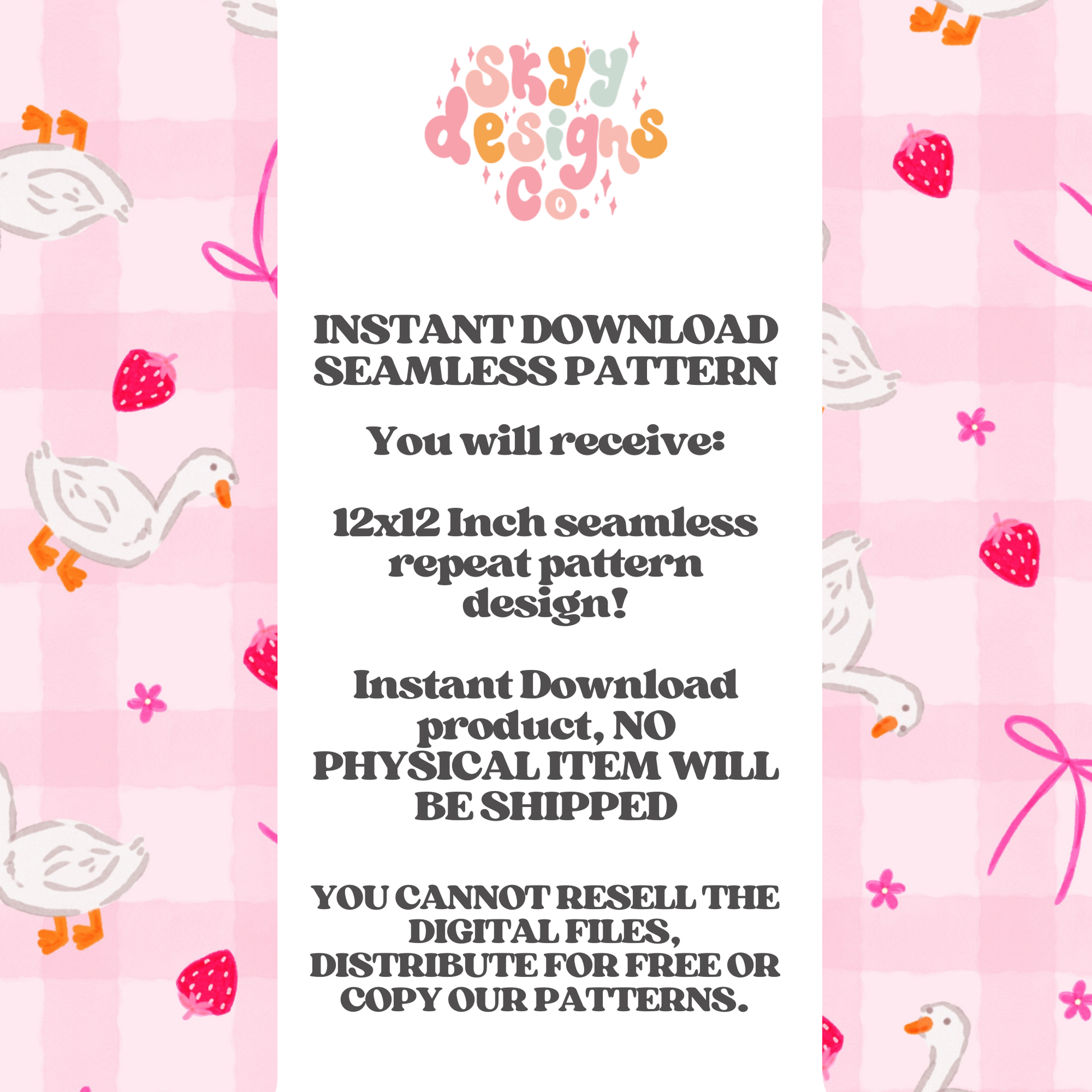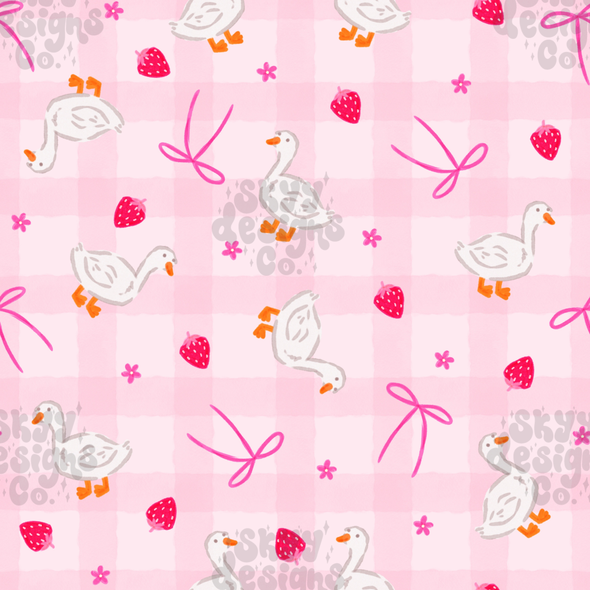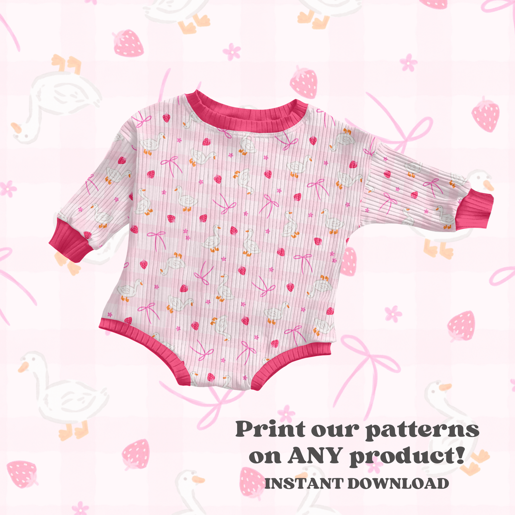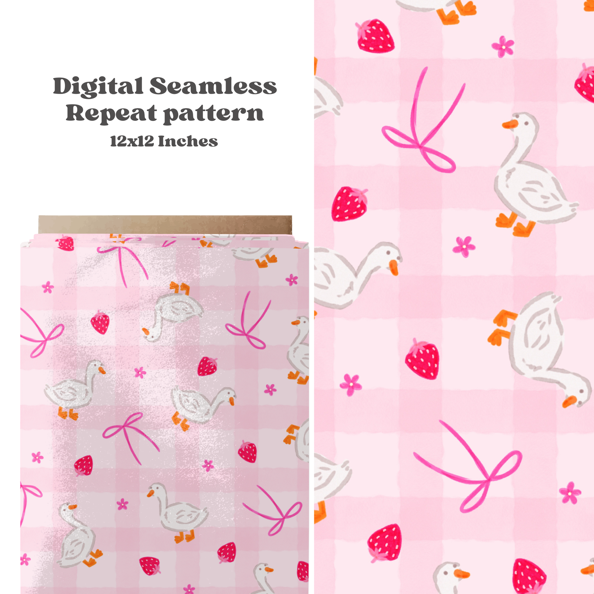 Brighten your product collection with this cheerful digital seamless pattern showcasing playful ducks, ripe strawberries, delicate bows, and spring blossoms. Download instantly and apply to any project—fabrics, wallpapers, packaging, apparel, and more. The seamless repeat ensures flawless tiling across all your creative endeavors.