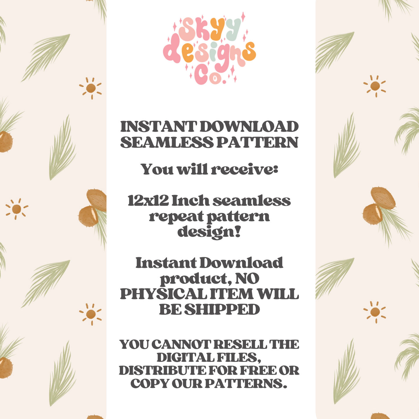 Introducing our Summer Coconut Palms Pattern, perfect for digital downloads and printing onto any product. This seamless design in JPEG format will add a tropical touch to your products. Enhance your summer-themed items with this versatile and high-quality pattern. Download now and elevate your designs with a touch of paradise.
