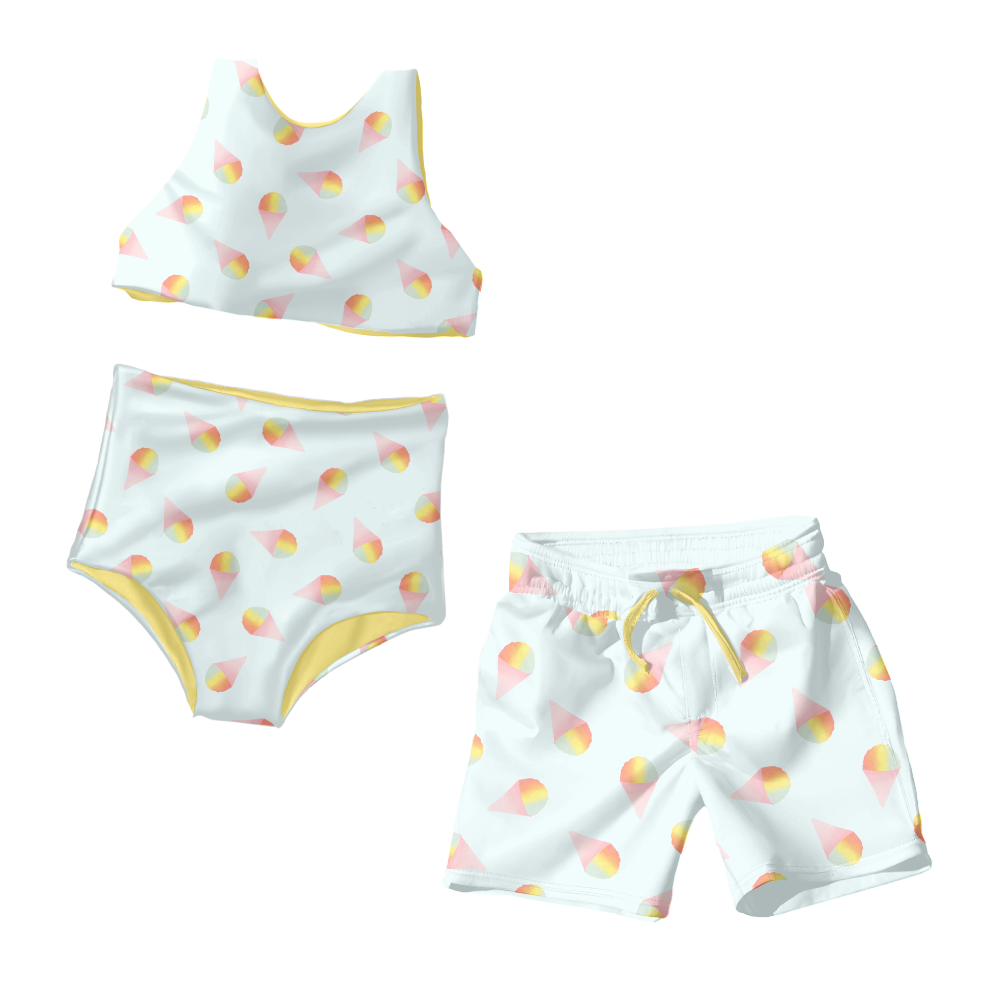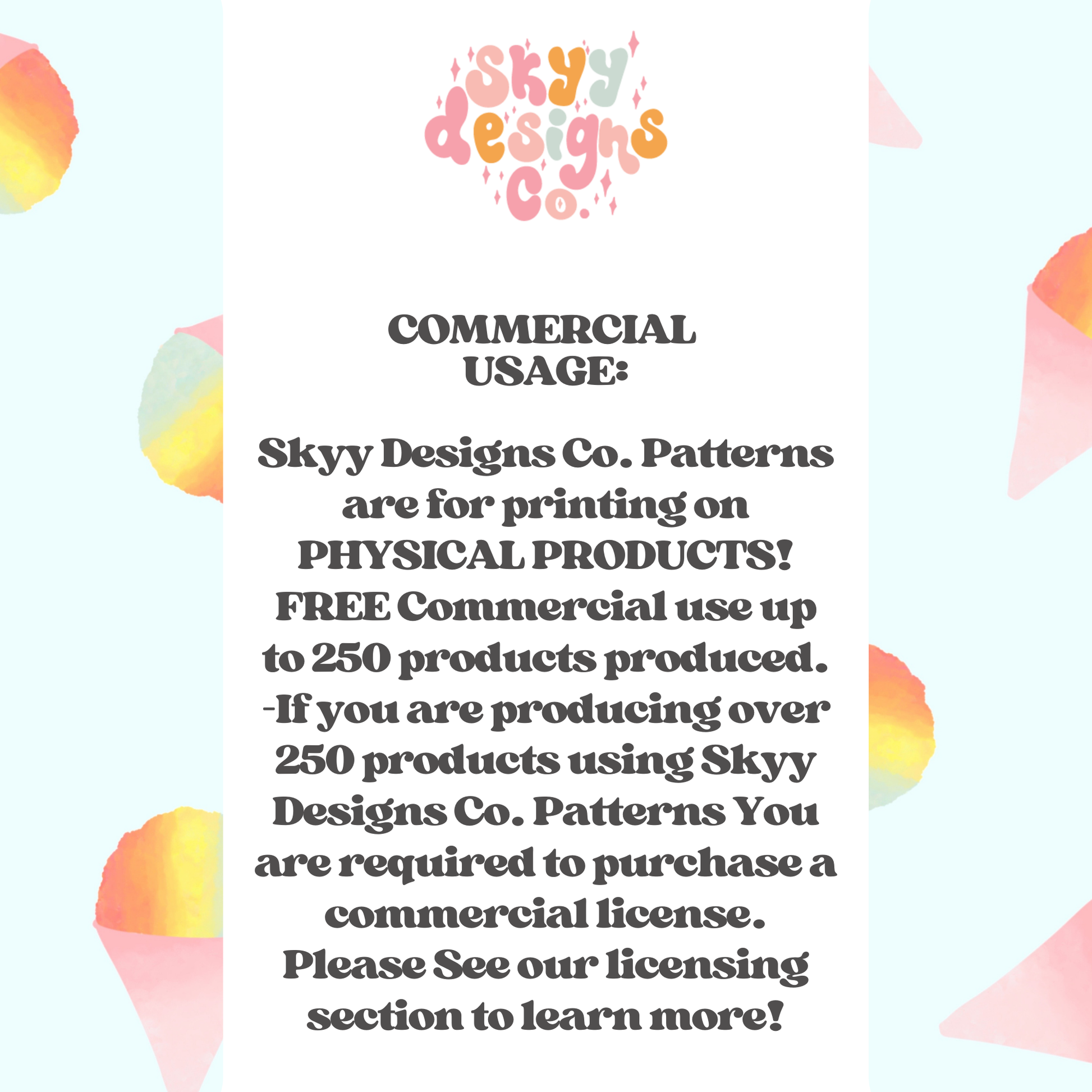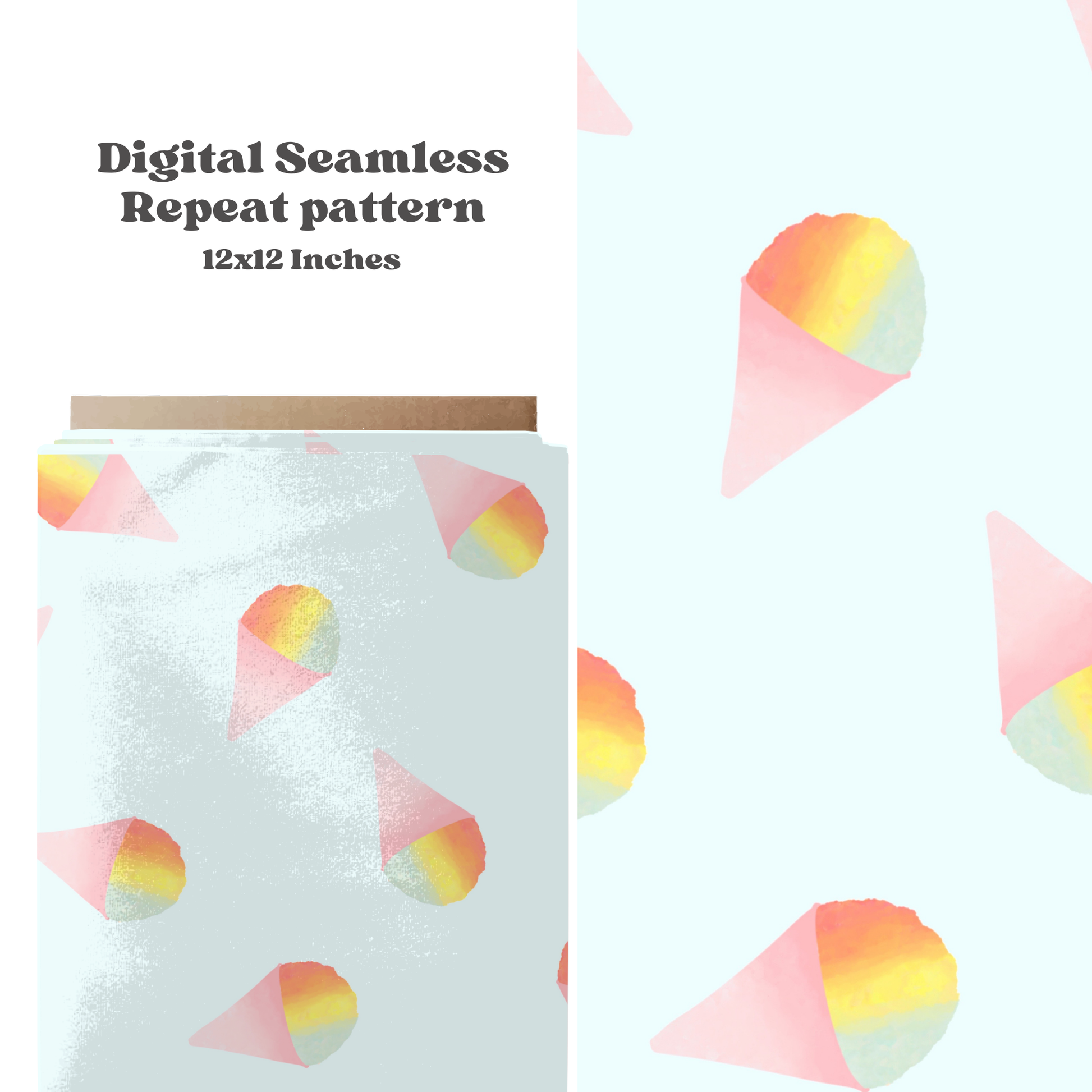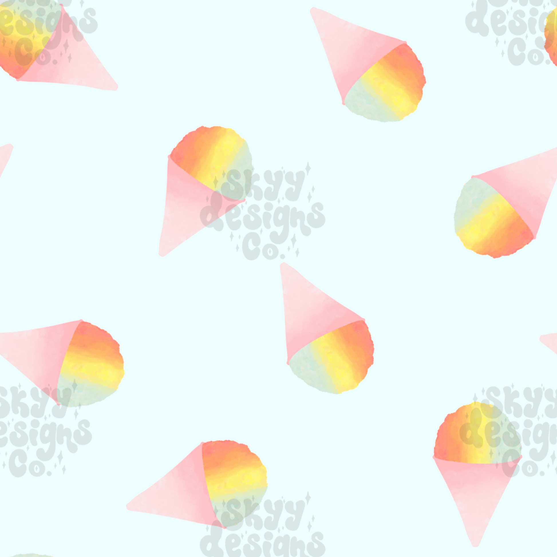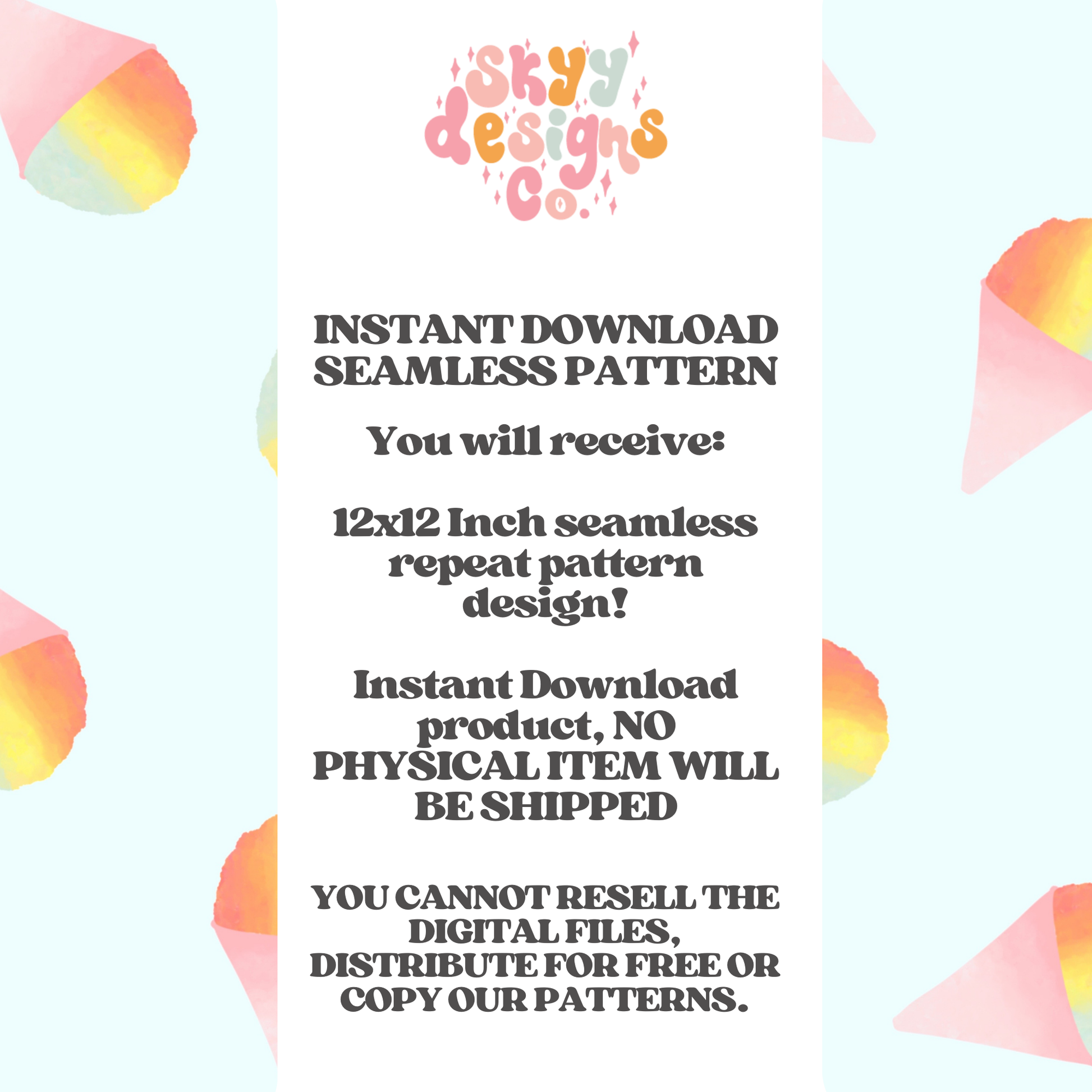 This digital seamless pattern features bright, colorful snow cones on a light blue background. Download instantly and use it on any product—perfect for summer apparel, accessories, and kids' items. The cheerful design works great for seasonal collections and warm-weather merchandise. Simply apply to your products and start selling.