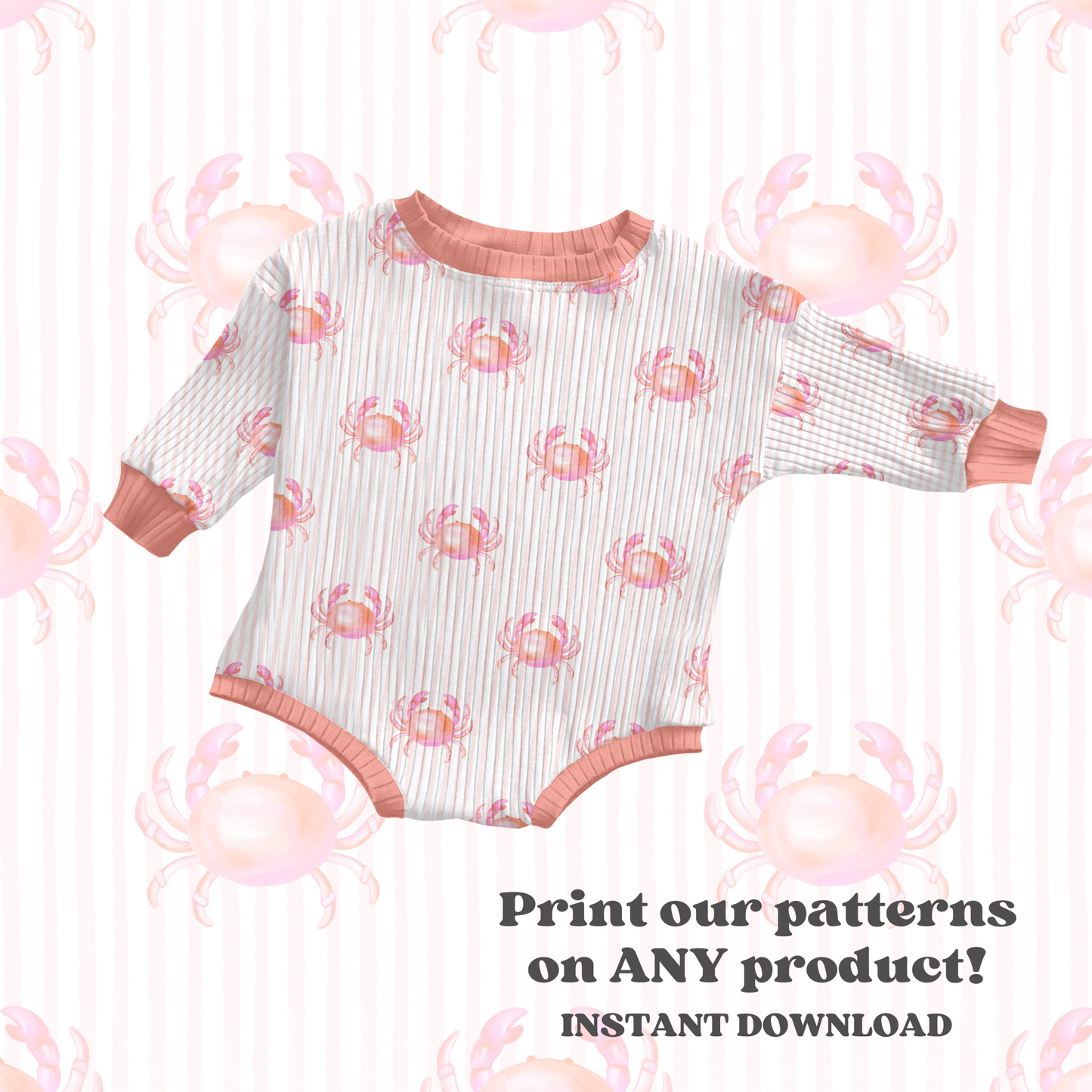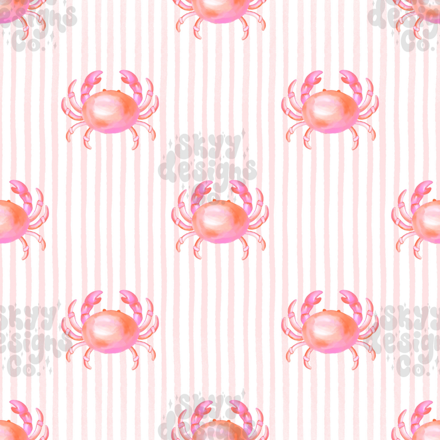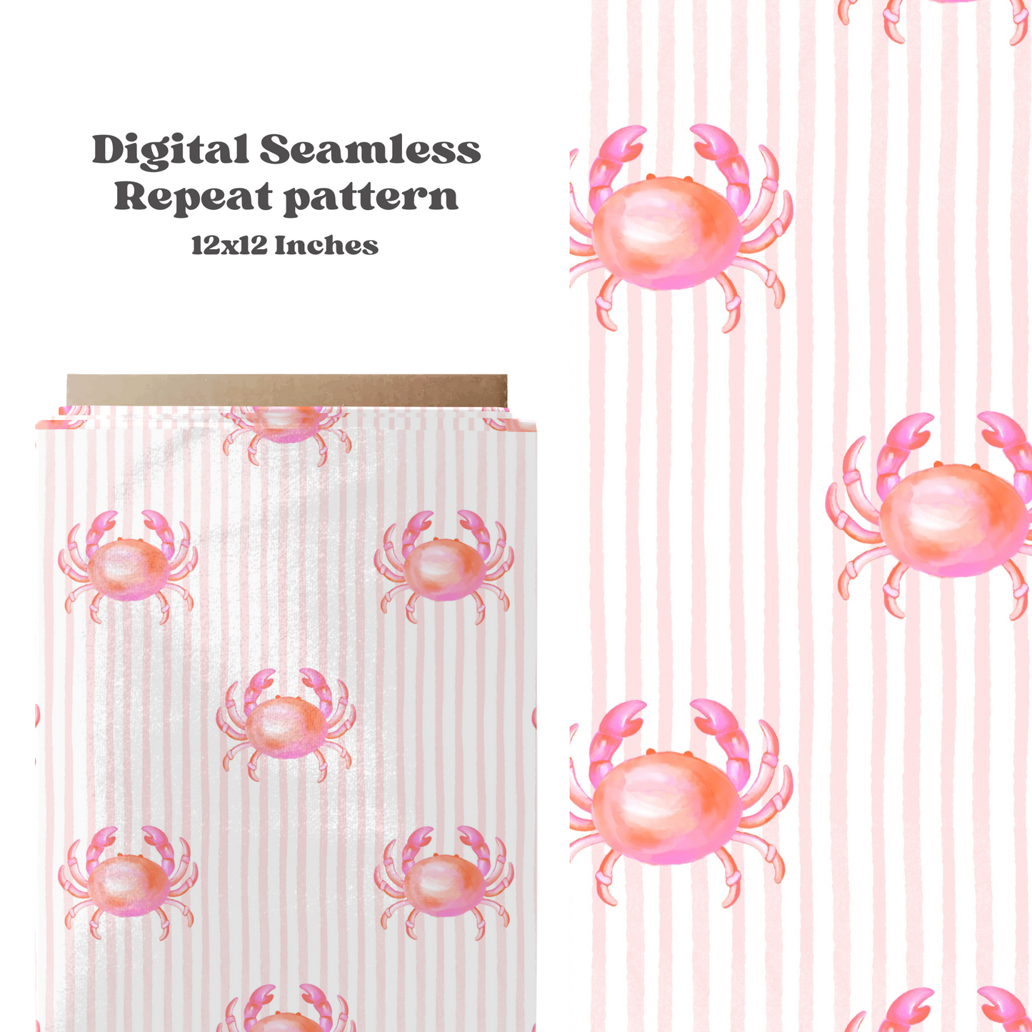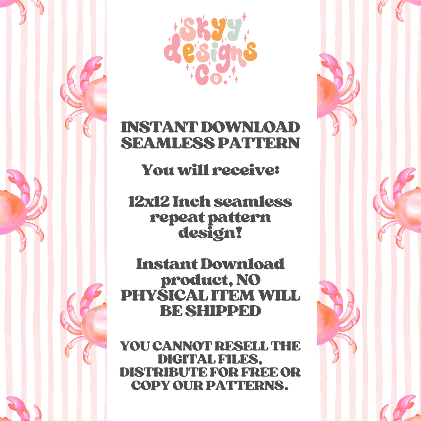 Add a touch of summer to any product with our Watercolor Preppy Crabs design. Featuring vibrant orange and pink watercolor crabs on a striped background, this seamless pattern is perfect for any season. Download instantly and bring a pop of color to your products.